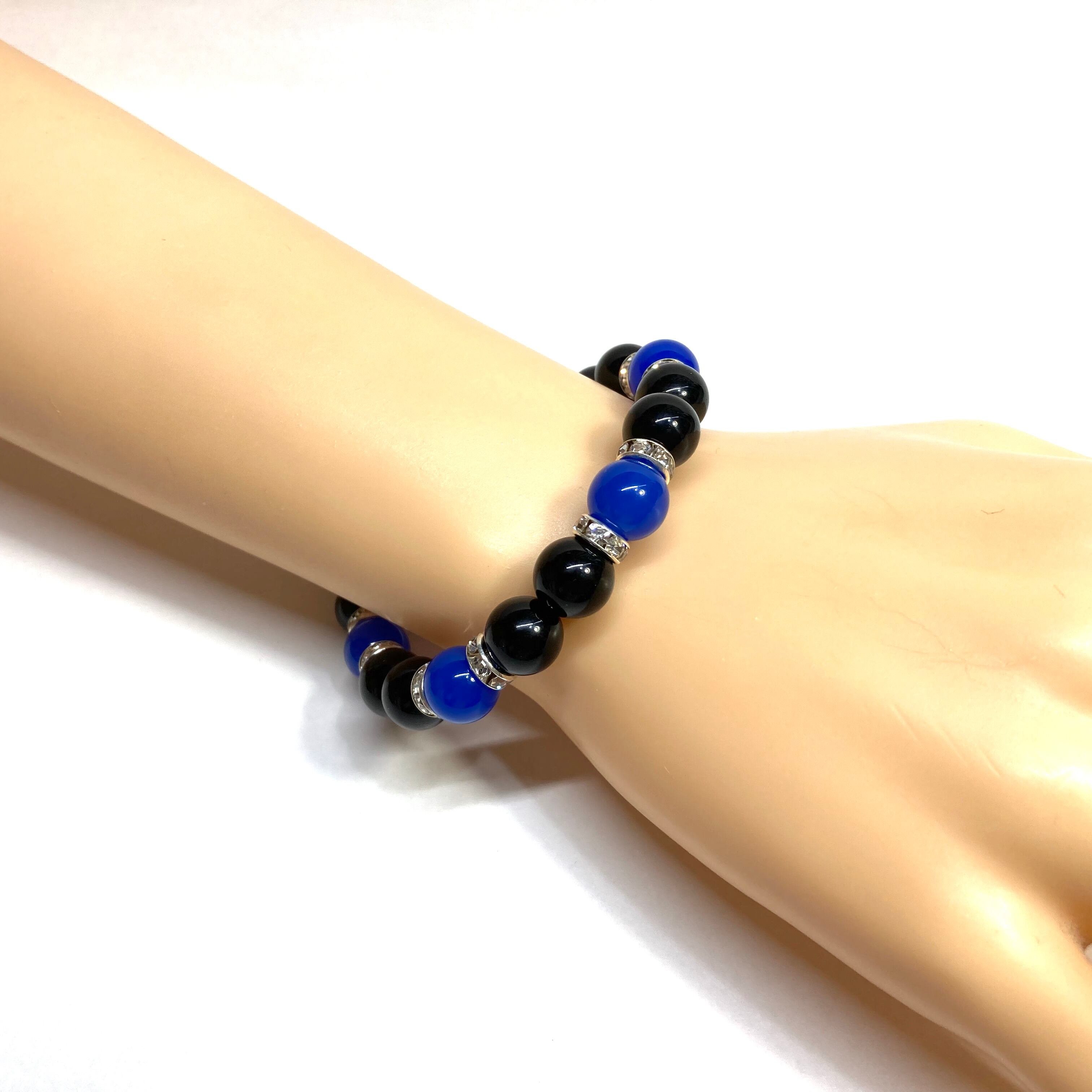 こちらは、モリオンと青瑪瑙を組み合わせたパワーストーンブレスレットです。間にはロンデルを挟み高級感あるデザインに仕上げております。石大きさは腕にも馴染みやすいように10mm玉で内径約18cm(伸可能)です。 数に限りがございますので気になる方はお早めにどうぞ。