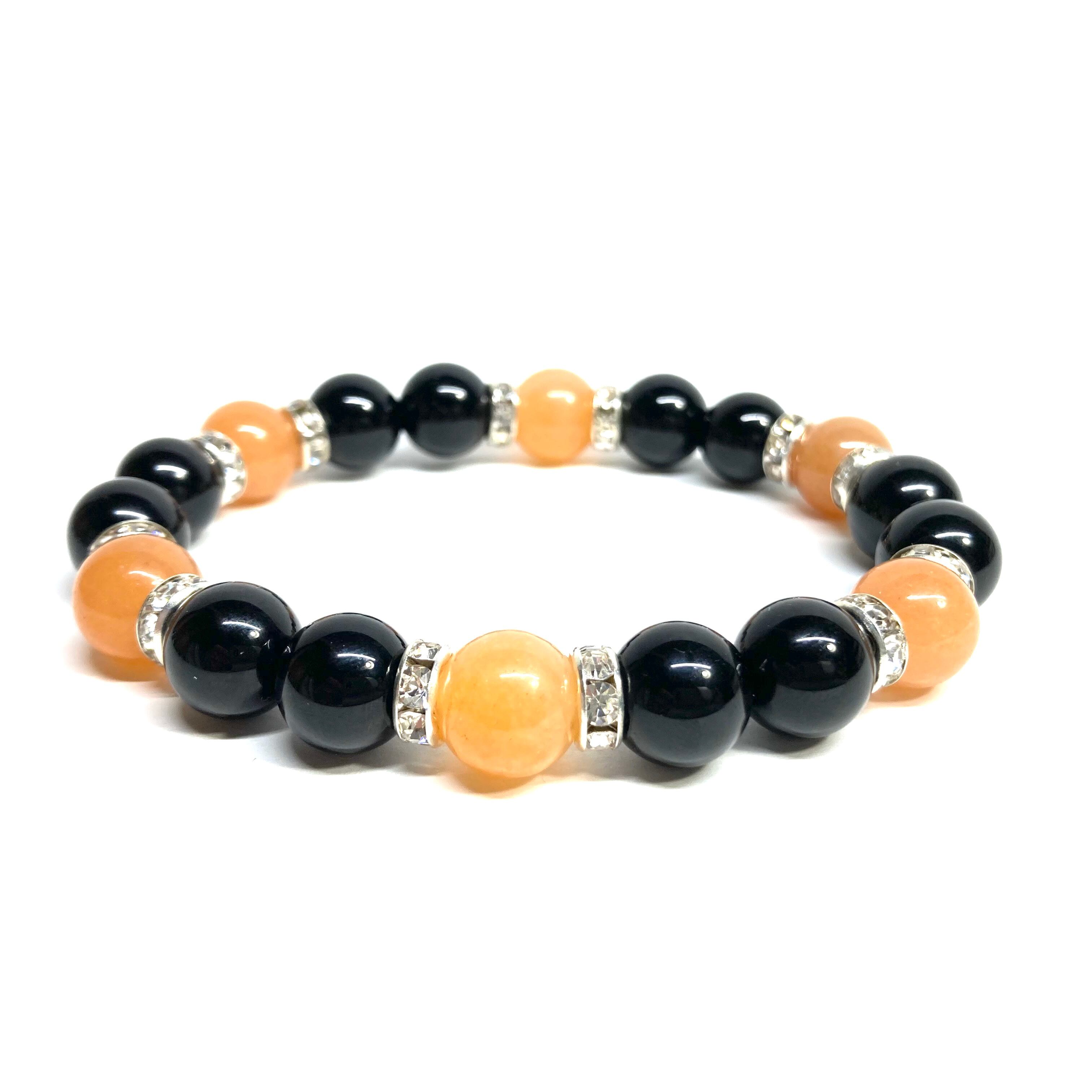こちらは、モリオンとレッドアベンチュリンを組み合わせたパワーストーンブレスレットです。間にはロンデルを挟み高級感あるデザインに仕上げております。石大きさは腕にも馴染みやすいように10mm玉で内径約18cm(伸可能)です。 数に限りがございますので気になる方はお早めにどうぞ。