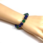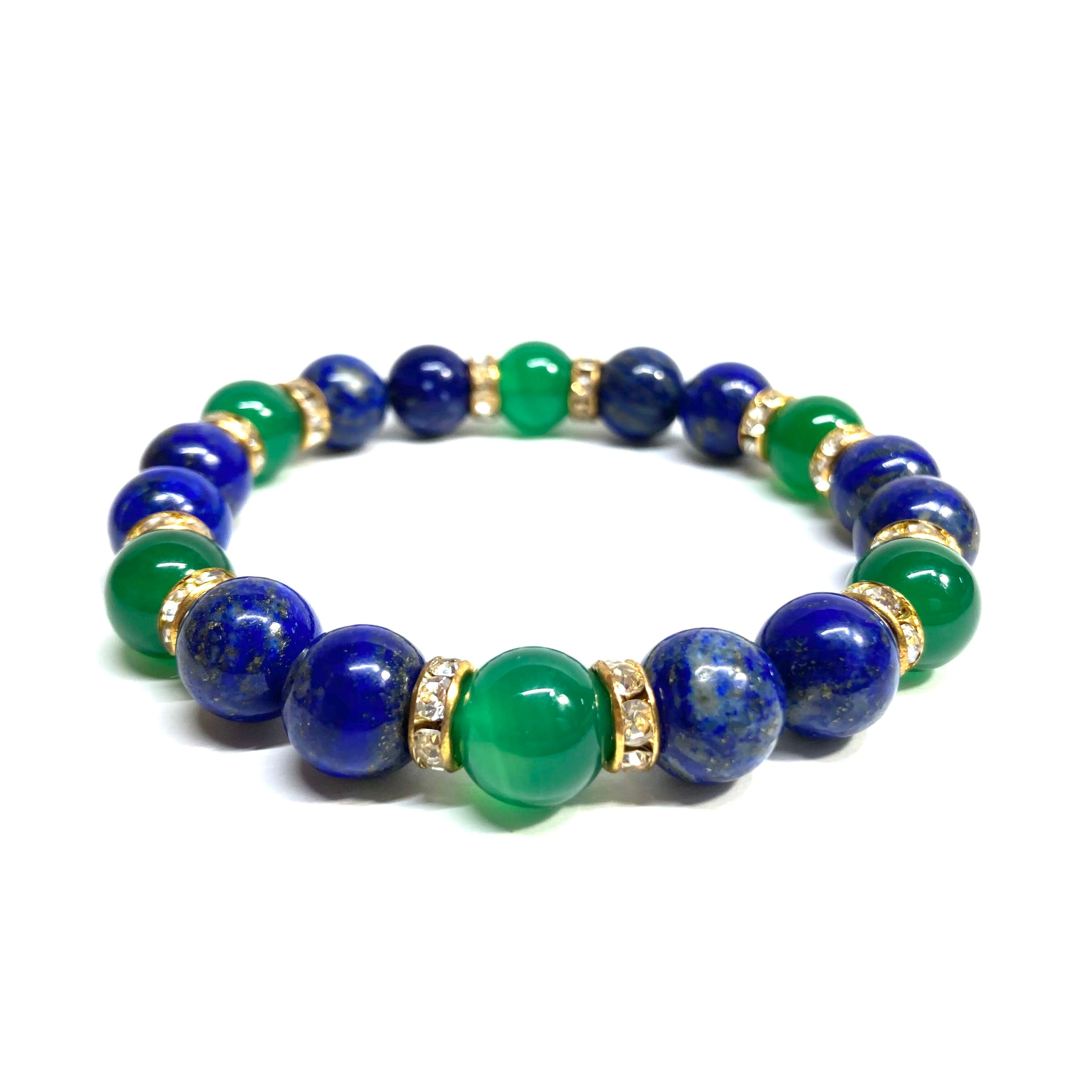 こちらは、ラピスラズリと緑瑪瑙を組み合わせたパワーストーンブレスレットです。間にはロンデルを挟み高級感あるデザインに仕上げております。石大きさは腕にも馴染みやすいように10mm玉で内径約18cm(伸可能)です。 数に限りがございますので気になる方はお早めにどうぞ。