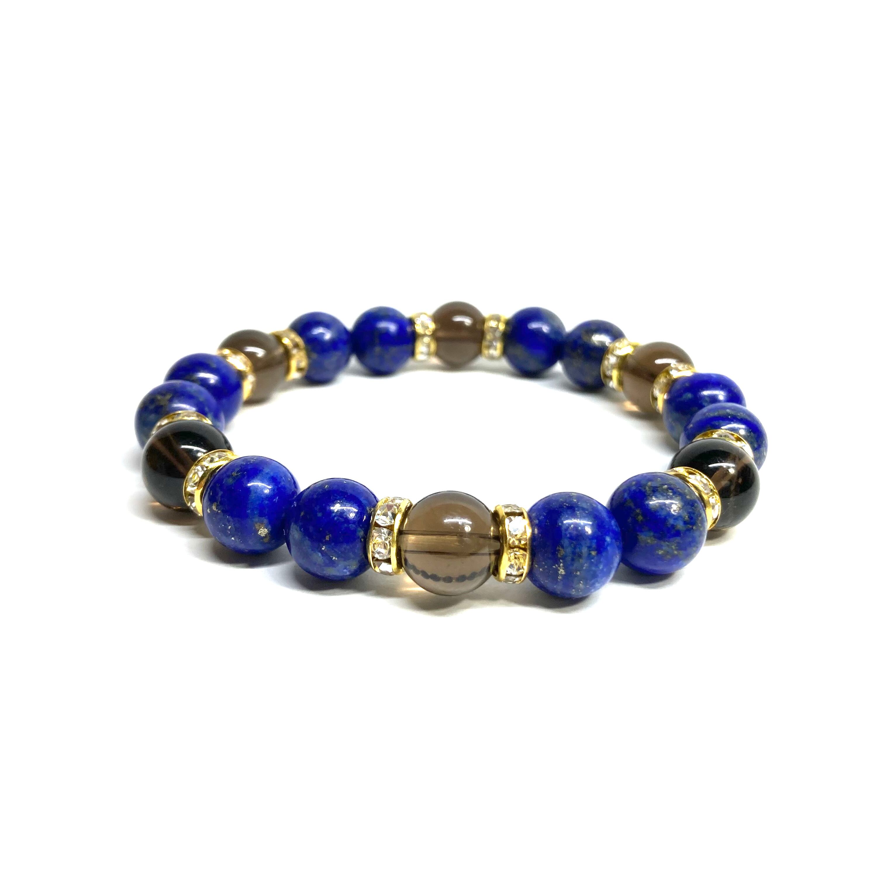 こちらは、ラピスラズリとスモーキークォーツを組み合わせたパワーストーンブレスレットです。間にはロンデルを挟み高級感あるデザインに仕上げております。石大きさは腕にも馴染みやすいように10mm玉で内径約18cm(伸可能)です。 数に限りがございますので気になる方はお早めにどうぞ。