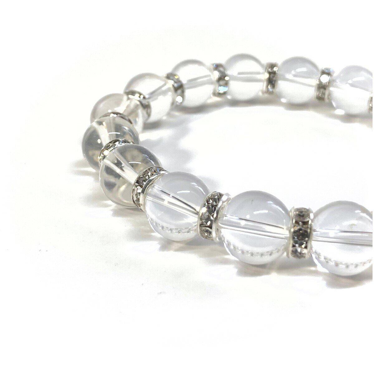 こちらは、水晶の10mm玉を使用したパワーストーンブレスレットです。石との間にはロンデルを挟み高級感を演出しております。シンプルなデザインは、シーン問わずどんなコーディネートとも合わせ易いブレスレットです。サイズは種類を選択からお選びください。(内周約14cm?内周約22cmでお選び頂けます)当社の中でも一番人気の実績があるデザインとなっております。気になる方はお早めにどうぞ。