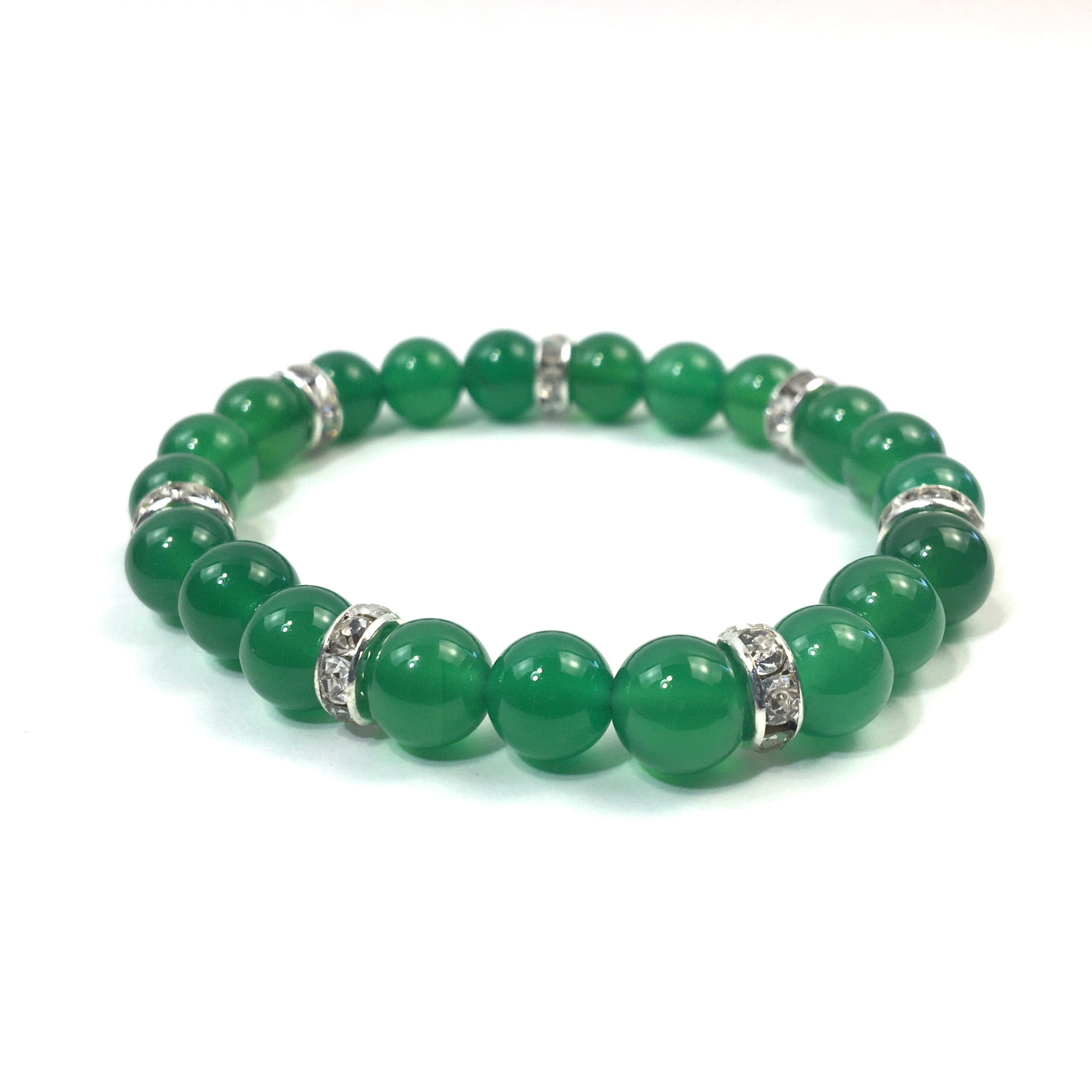 こちらは、8mm玉の緑瑪瑙を使ったパワーストーンブレスレットです。シンプルなデザインでどんなコーディネートにも合わせやすいデザインに仕上げています。サイズは内周約15cmです。気になる方は是非この機会にどうぞ。