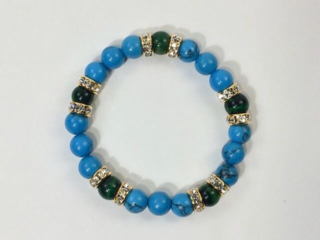 こちらは、8mm玉のターコイズとグリーンタイガーアイを使ったパワーストーンブレスレットです。シンプルなデザインでどんなコーディネートにも合わせやすいデザインに仕上げています。サイズは内径約15cmです。気になる方は是非この機会にどうぞ。