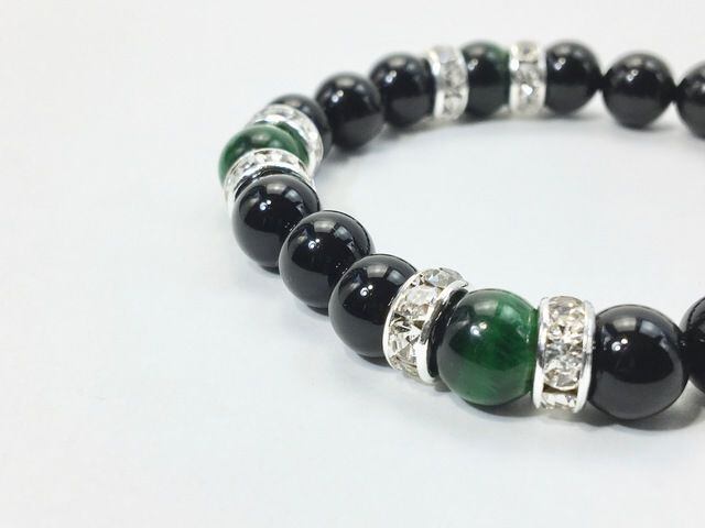 こちらは、8mm玉のオニキスとグリーンタイガーアイを使ったパワーストーンブレスレットです。シンプルなデザインでどんなコーディネートにも合わせやすいデザインに仕上げています。サイズは内周約15cmです。気になる方は是非この機会にどうぞ。