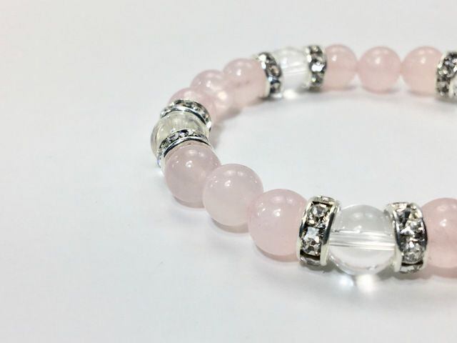 こちらは、8mm玉のローズクォーツと水晶を使ったパワーストーンブレスレットです。シンプルなデザインでどんなコーディネートにも合わせやすいデザインに仕上げています。サイズは内周約15cmです。気になる方は是非この機会にどうぞ。