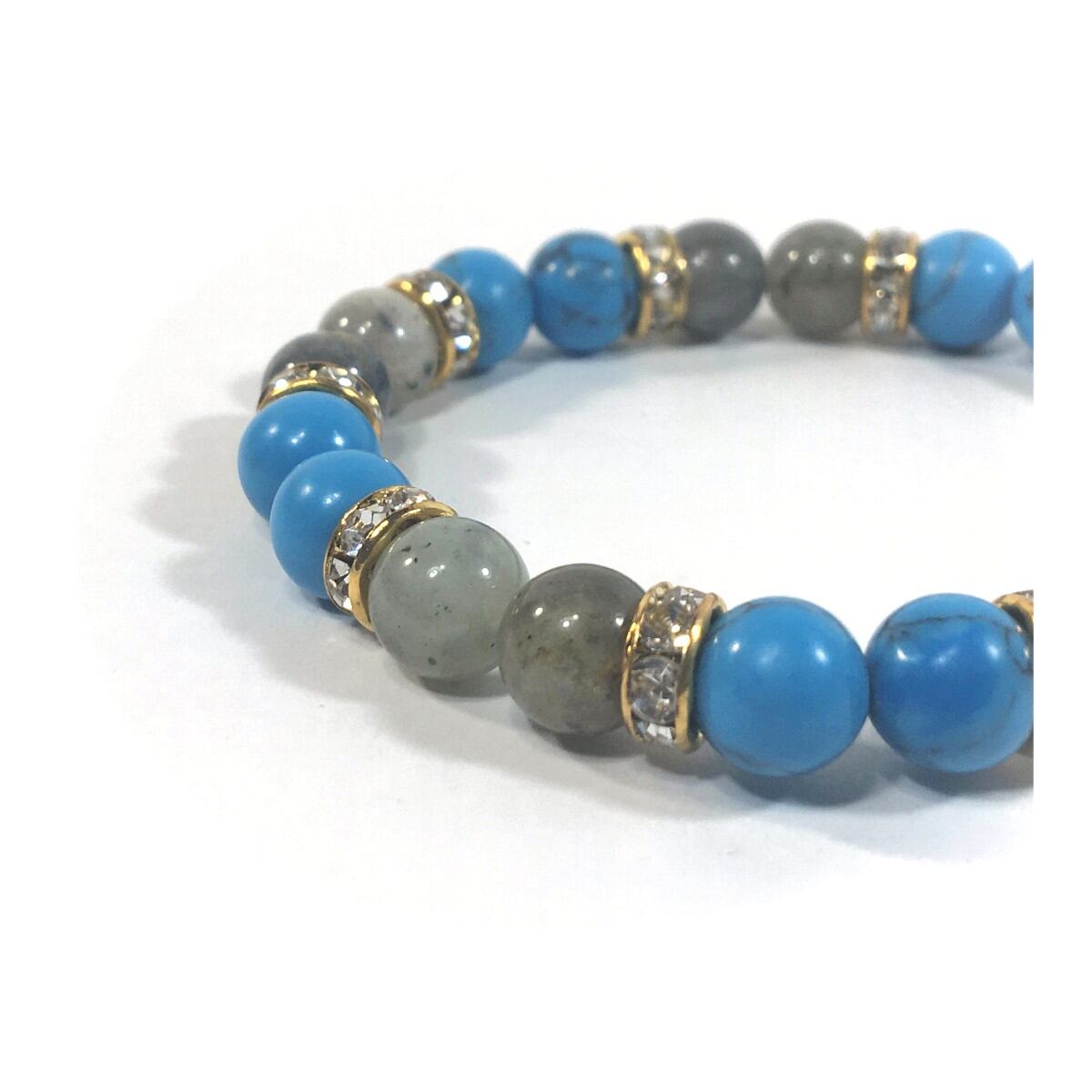 こちらは、8mm玉のターコイズとラブラドライトを使ったパワーストーンブレスレットです。シンプルなデザインでどんなコーディネートにも合わせやすいデザインに仕上げています。サイズは内周約15cmです。気になる方は是非この機会にどうぞ。