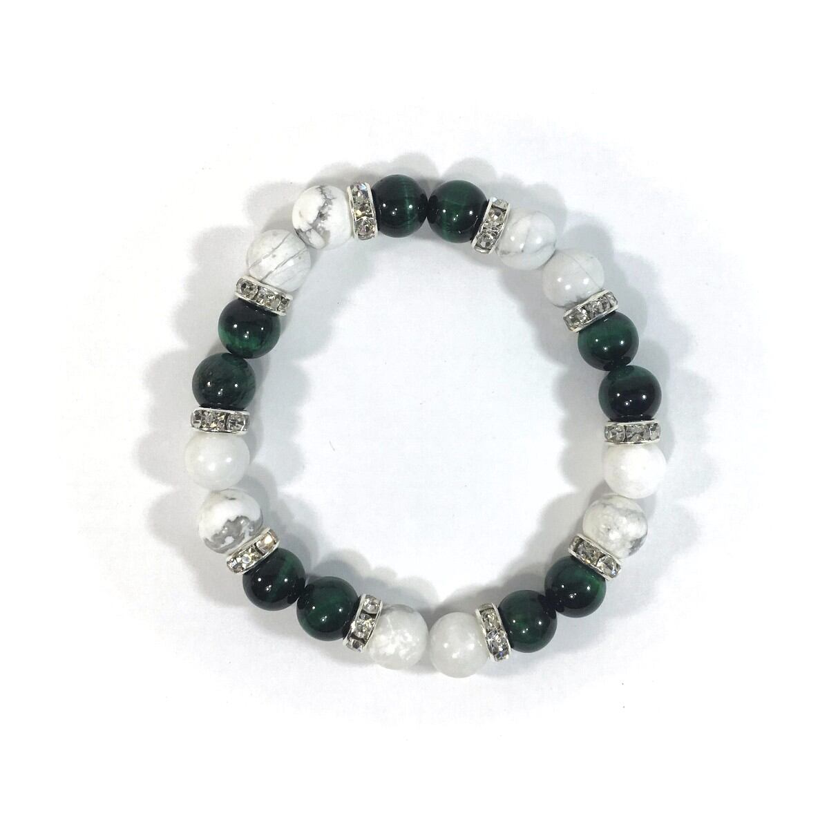 こちらは、8mm玉のハウライトとグリーンタイガーアイを使ったパワーストーンブレスレットです。シンプルなデザインでどんなコーディネートにも合わせやすいデザインに仕上げています。サイズは内周約15cmです。気になる方は是非この機会にどうぞ。