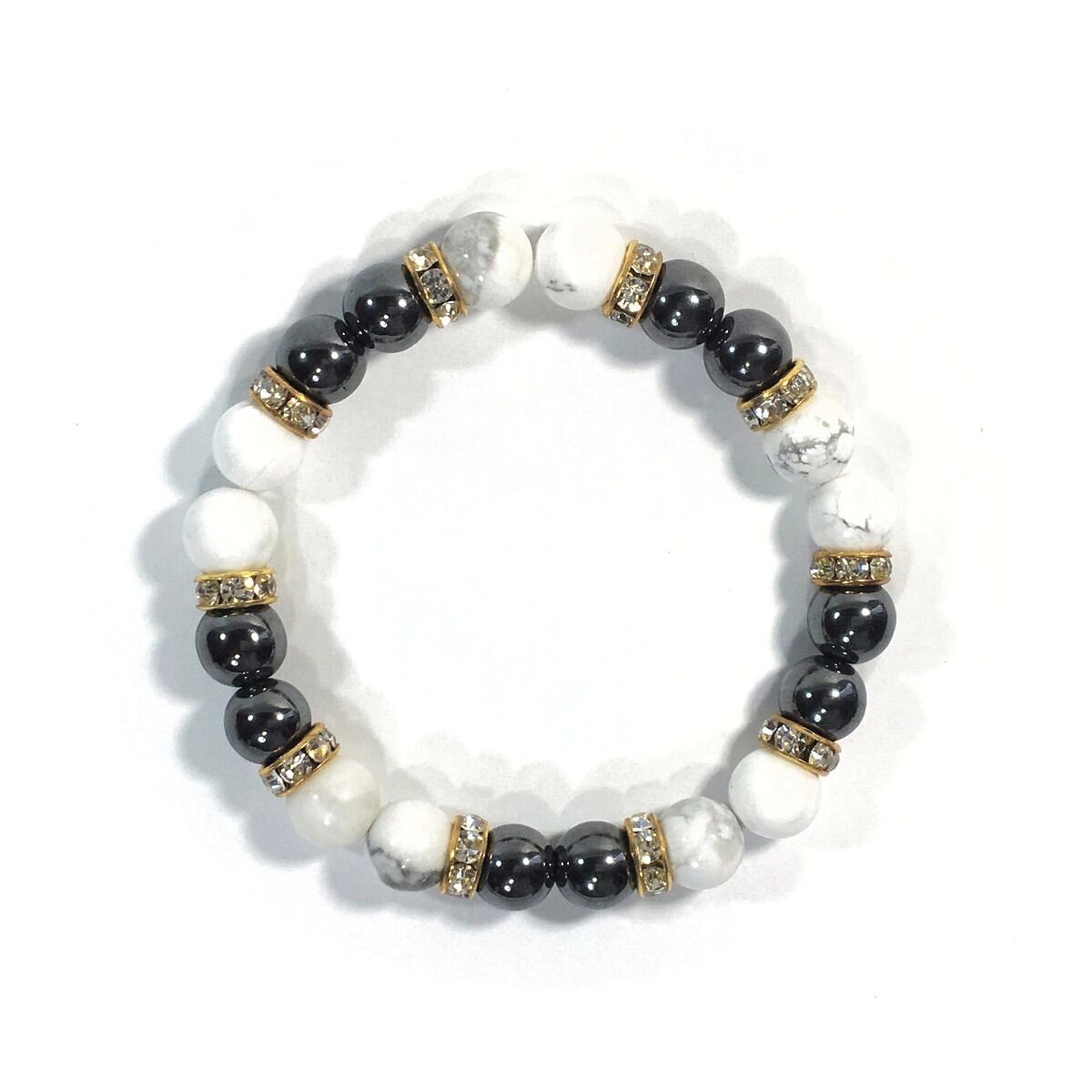 こちらは、8mm玉のハウライトとヘマタイトを使ったパワーストーンブレスレットです。シンプルなデザインでどんなコーディネートにも合わせやすいデザインに仕上げています。サイズは内周約15cmです。気になる方は是非この機会にどうぞ。