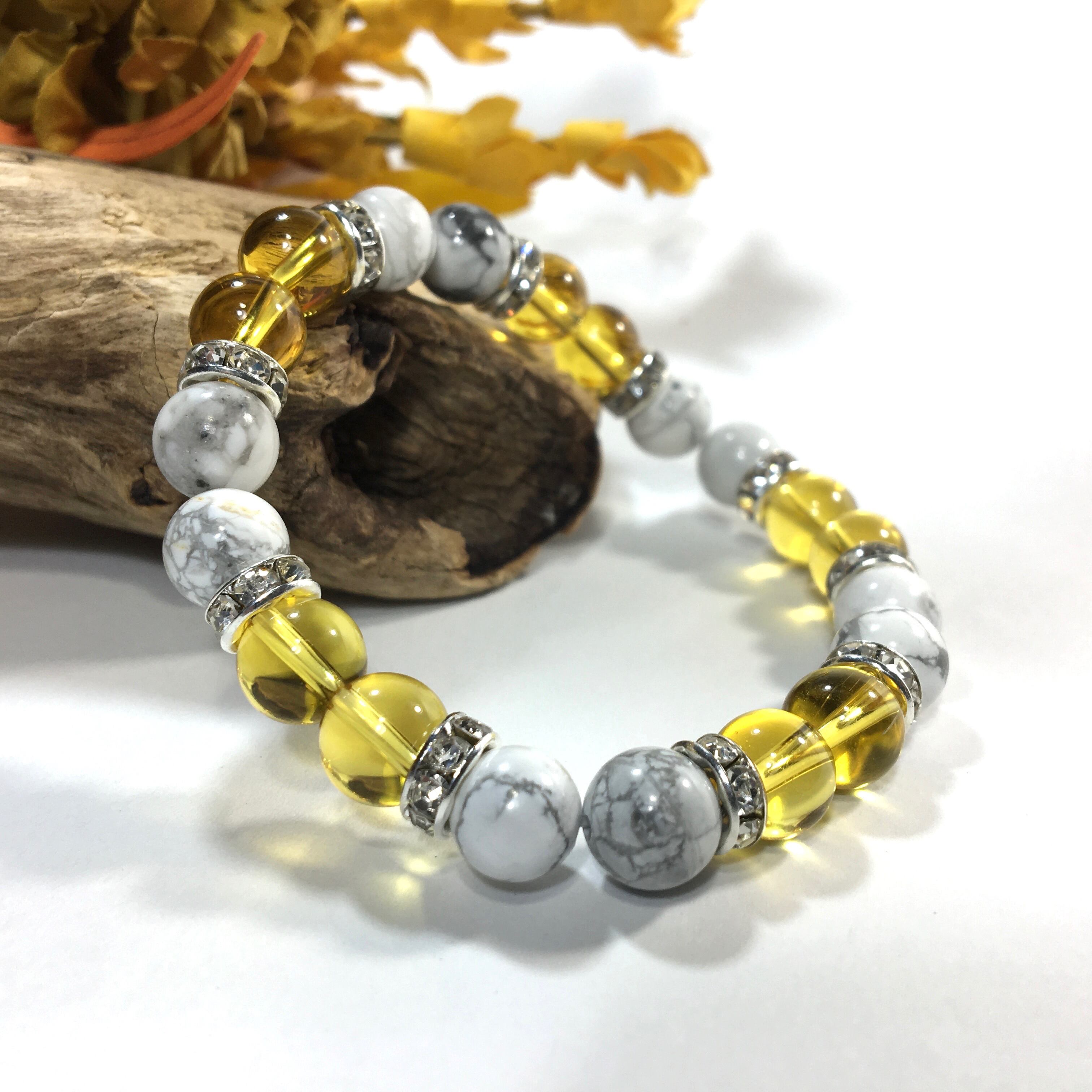 こちらは、8mm玉のハウライトとシトリンを使ったパワーストーンブレスレットです。シンプルなデザインでどんなコーディネートにも合わせやすいデザインに仕上げています。サイズは内周約15cmです。気になる方は是非この機会にどうぞ。