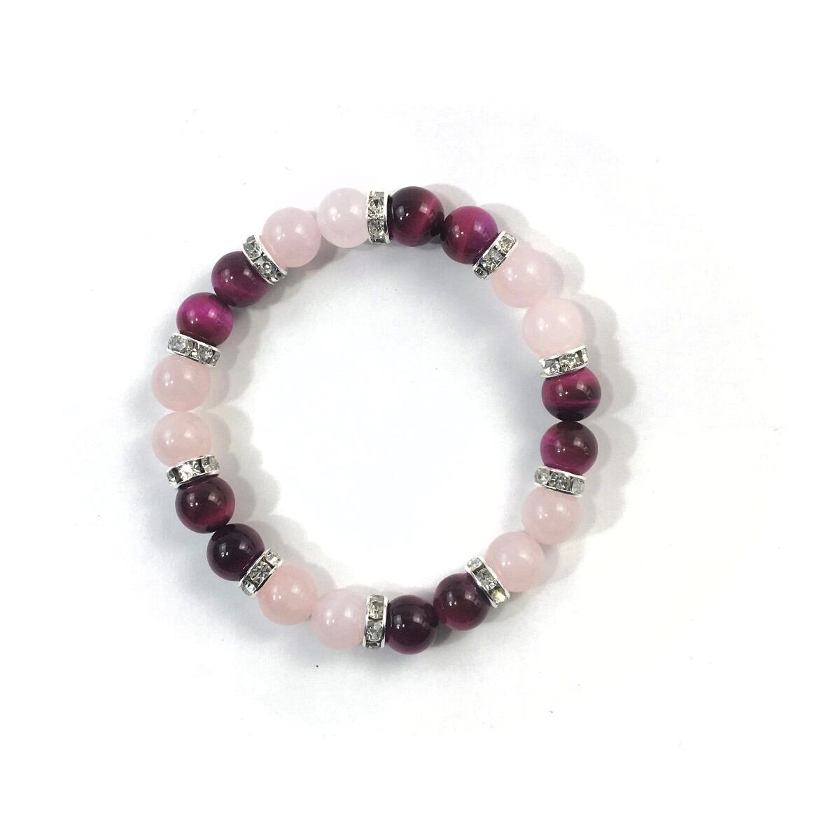 こちらは、8mm玉のローズクォーツとピンクタイガーアイを使ったパワーストーンブレスレットです。シンプルなデザインでどんなコーディネートにも合わせやすいデザインに仕上げています。サイズは内周約15cmです。気になる方は是非この機会にどうぞ。