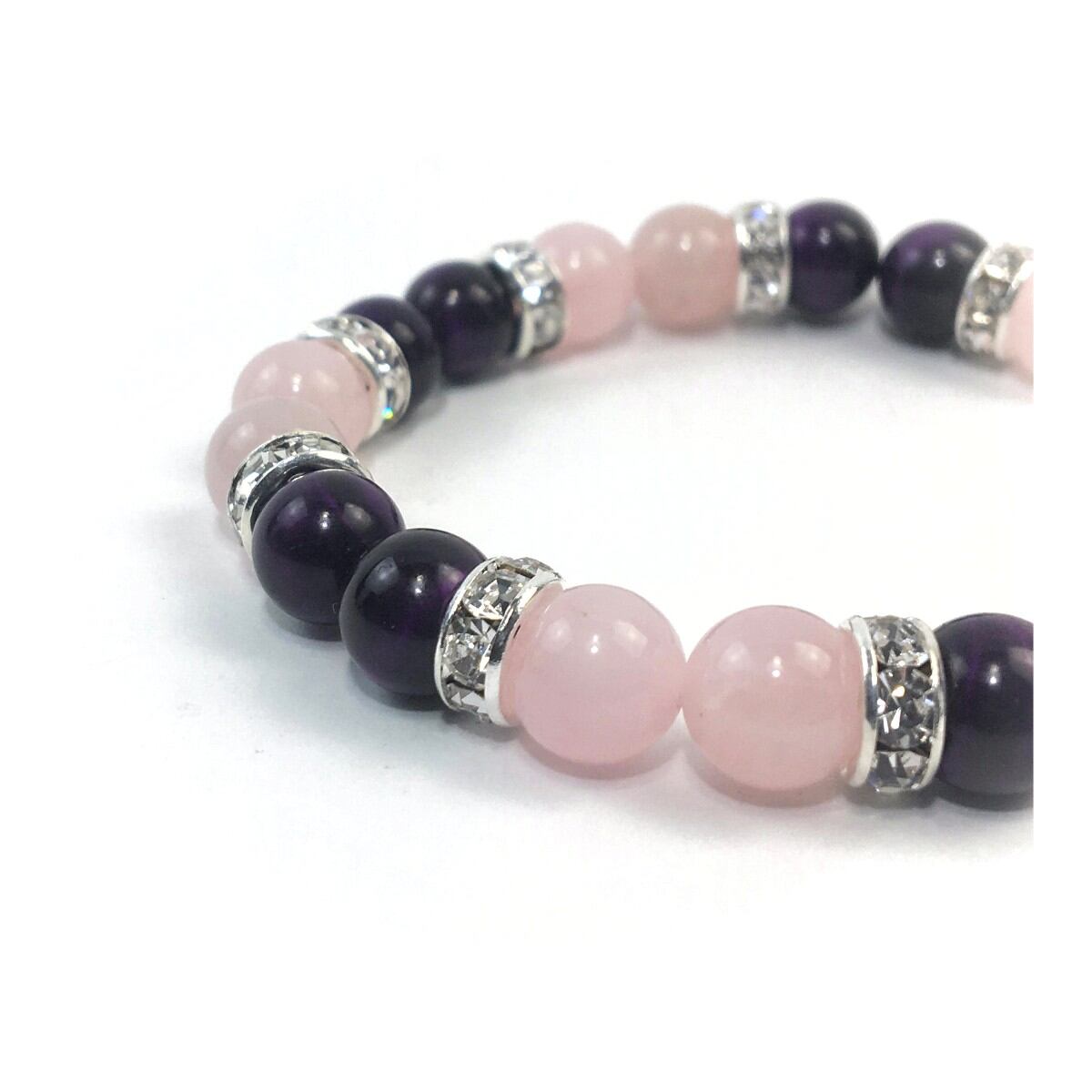 こちらは、8mm玉のローズクォーツとパープルタイガーアイを使ったパワーストーンブレスレットです。シンプルなデザインでどんなコーディネートにも合わせやすいデザインに仕上げています。サイズは内周約15cmです。気になる方は是非この機会にどうぞ。