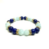こちらは、8mm玉のラピスラズリとアクアマリンを使ったパワーストーンブレスレットです。シンプルなデザインでどんなコーディネートにも合わせやすいデザインに仕上げています。サイズは内周 約15cmです。気になる方は是非この機会にどうぞ。