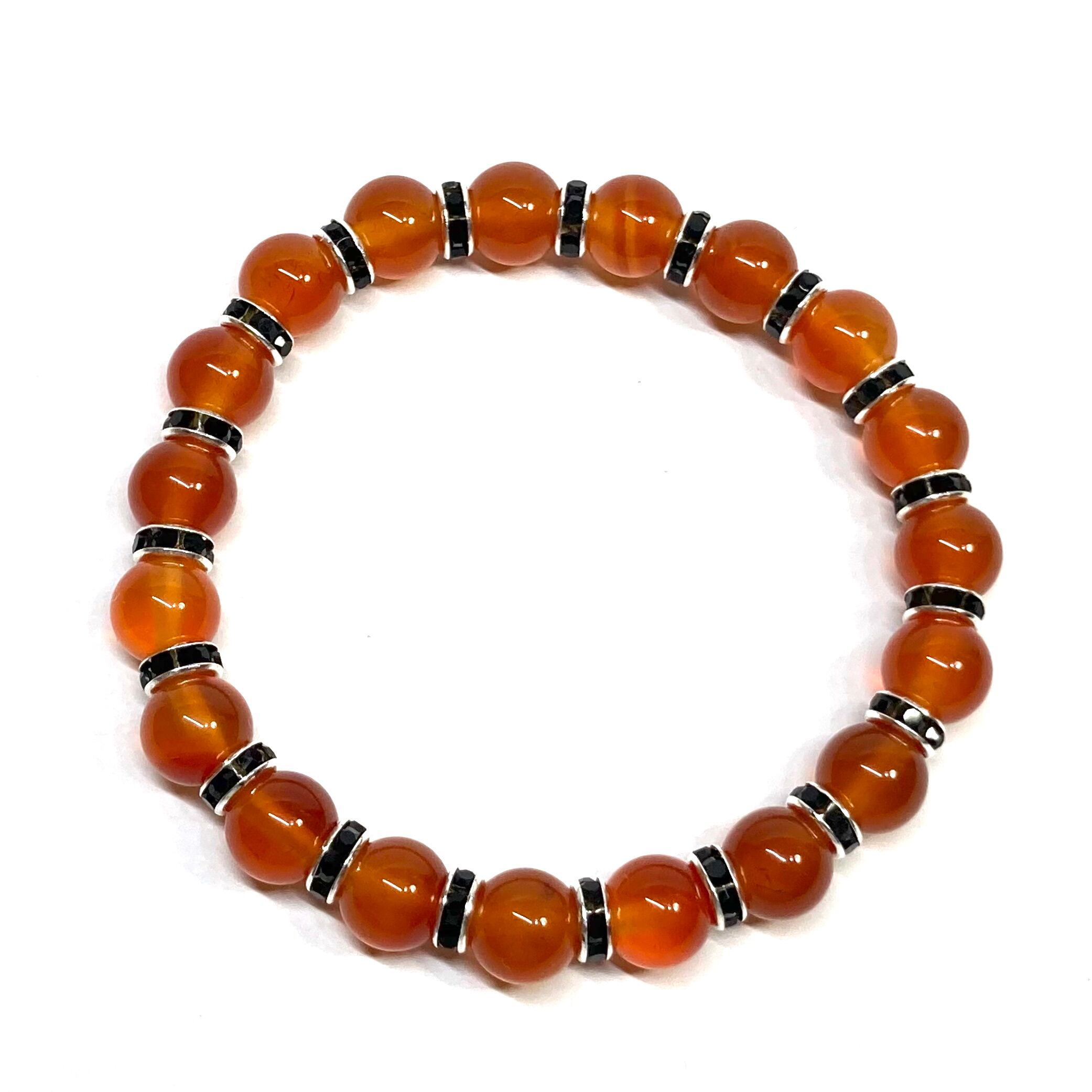 こちらは、カーネリアンの8mm玉を使用したパワーストーンブレスレットです。石との間にはロンデルを挟み高級感を演出しております。シンプルなデザインは、シーン問わずどんなコーディネートとも合わせ易いブレスレットです。サイズは内周約15cm (手首周りを測り少し余裕をもってお買い求めくださいませ。)です。当社の中でも一番人気の実績があるデザインとなっております。気になる方はお早めにどうぞ。