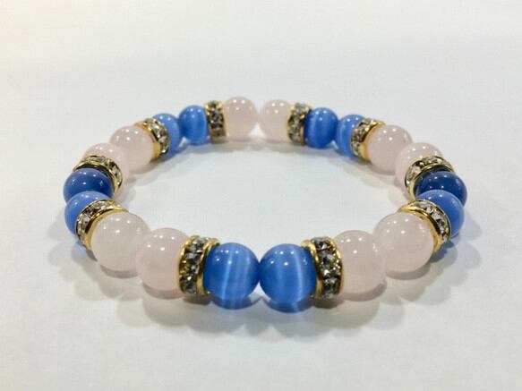 こちらは、8mm玉のブルーキャッツアイとローズクォーツを使用したパワーストーンブレスレットです。間にはロンデルを挟み高級感ある大人っぽいデザインに仕上がっています。サイズは内周約15cmです。気になる方は是非この機会にどうぞ。