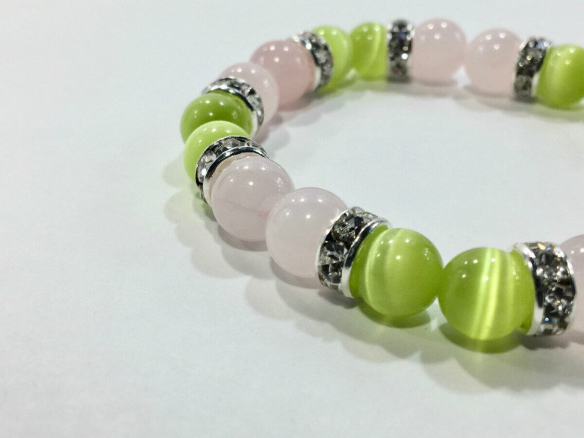 こちらは、8mm玉のライムグリーンキャッツアイとローズクォーツを使用したパワーストーンブレスレットです。間にはロンデルを挟み高級感ある大人っぽいデザインに仕上がっています。サイズは内周約15cmです。気になる方は是非この機会にどうぞ。
