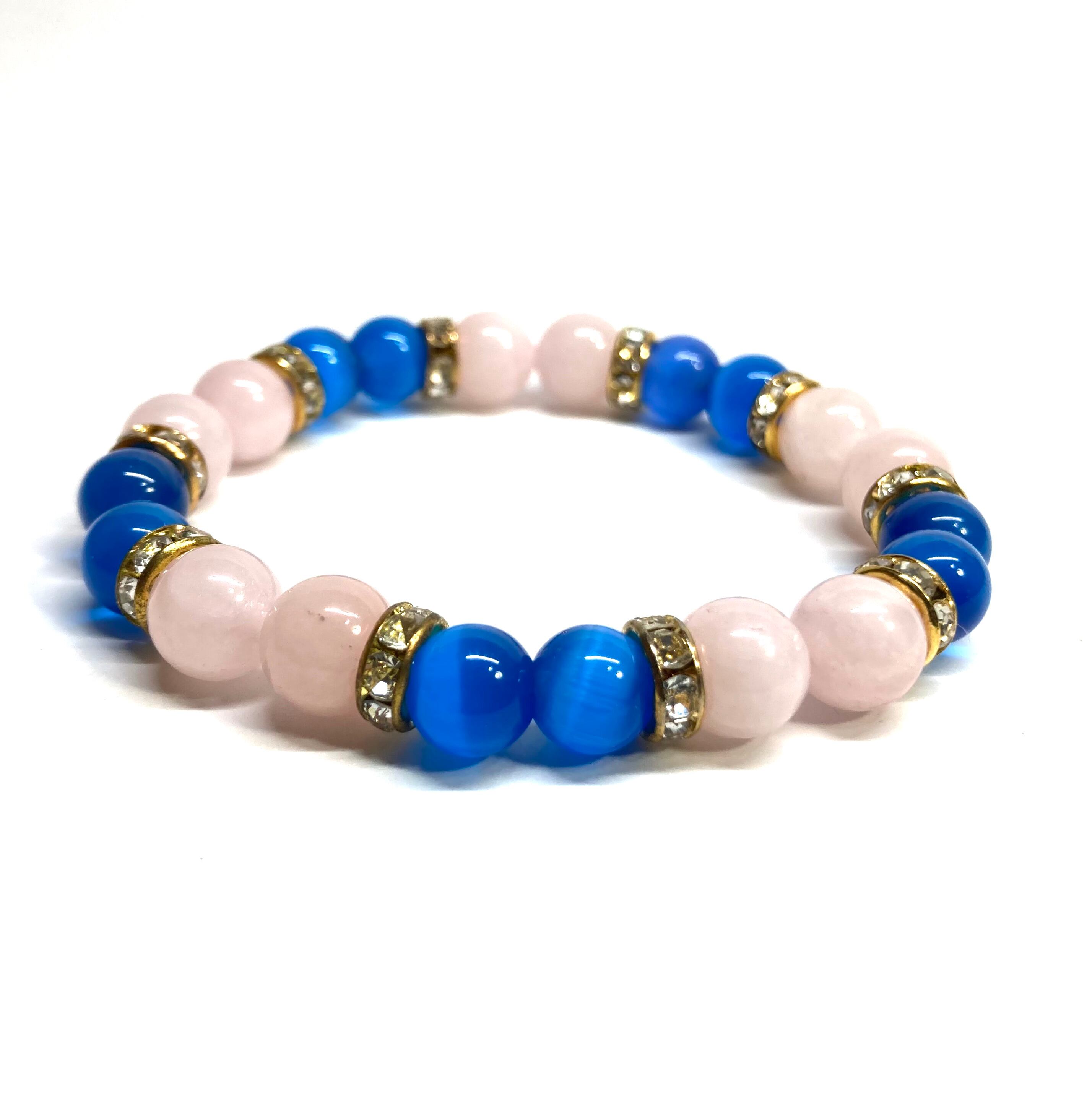 こちらは、8mm玉のブルーキャッツアイとローズクォーツを使用したパワーストーンブレスレットです。間にはゴールドのロンデルを挟み高級感ある大人っぽいデザインに仕上がっています。サイズは内周約15cmです。気になる方は是非この機会にどうぞ。