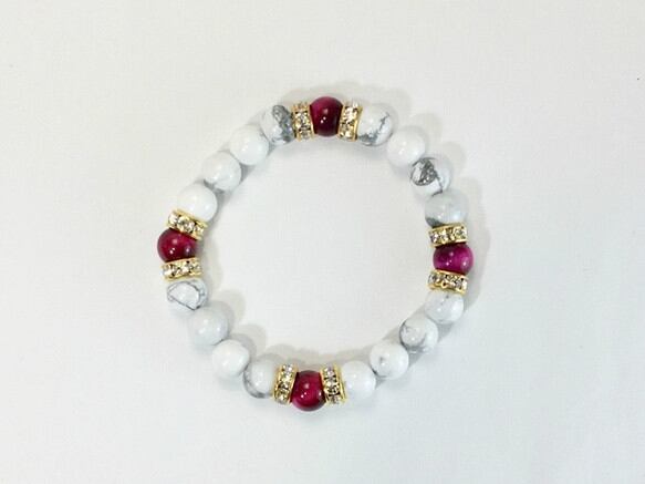 こちらは、8mm玉のピンクタイガーアイとハウライトを使用したパワーストーンブレスレットです。間にはロンデルを挟み高級感ある大人っぽいデザインに仕上がっています。内径約15cmです。気になる方は是非この機会にどうぞ。