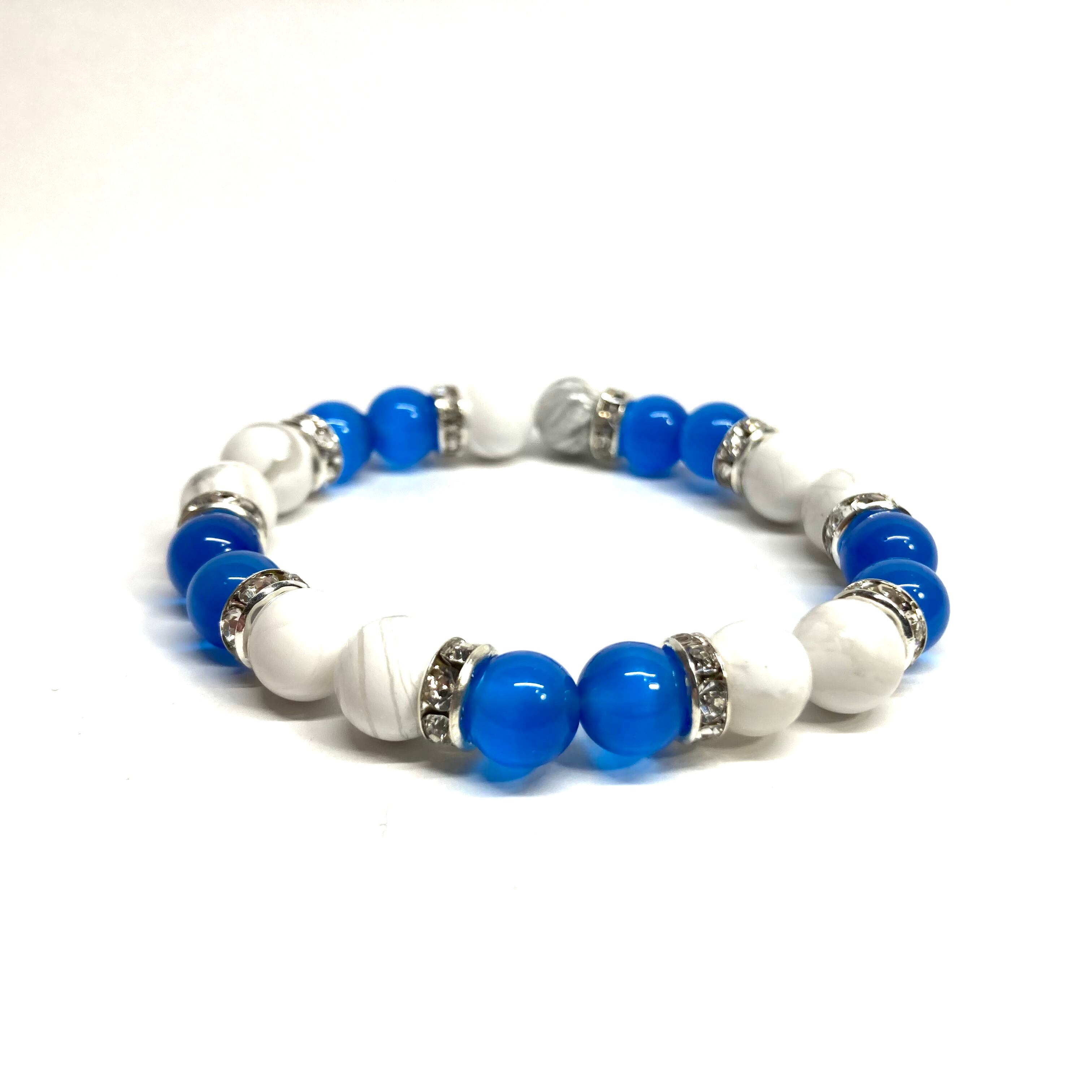 こちらは、8mm玉のブルーキャッツアイとハウライトを使用したパワーストーンブレスレットです。間にはシルバーのロンデルを挟み高級感ある大人っぽいデザインに仕上がっています。サイズは内周約15cmです。気になる方は是非この機会にどうぞ。