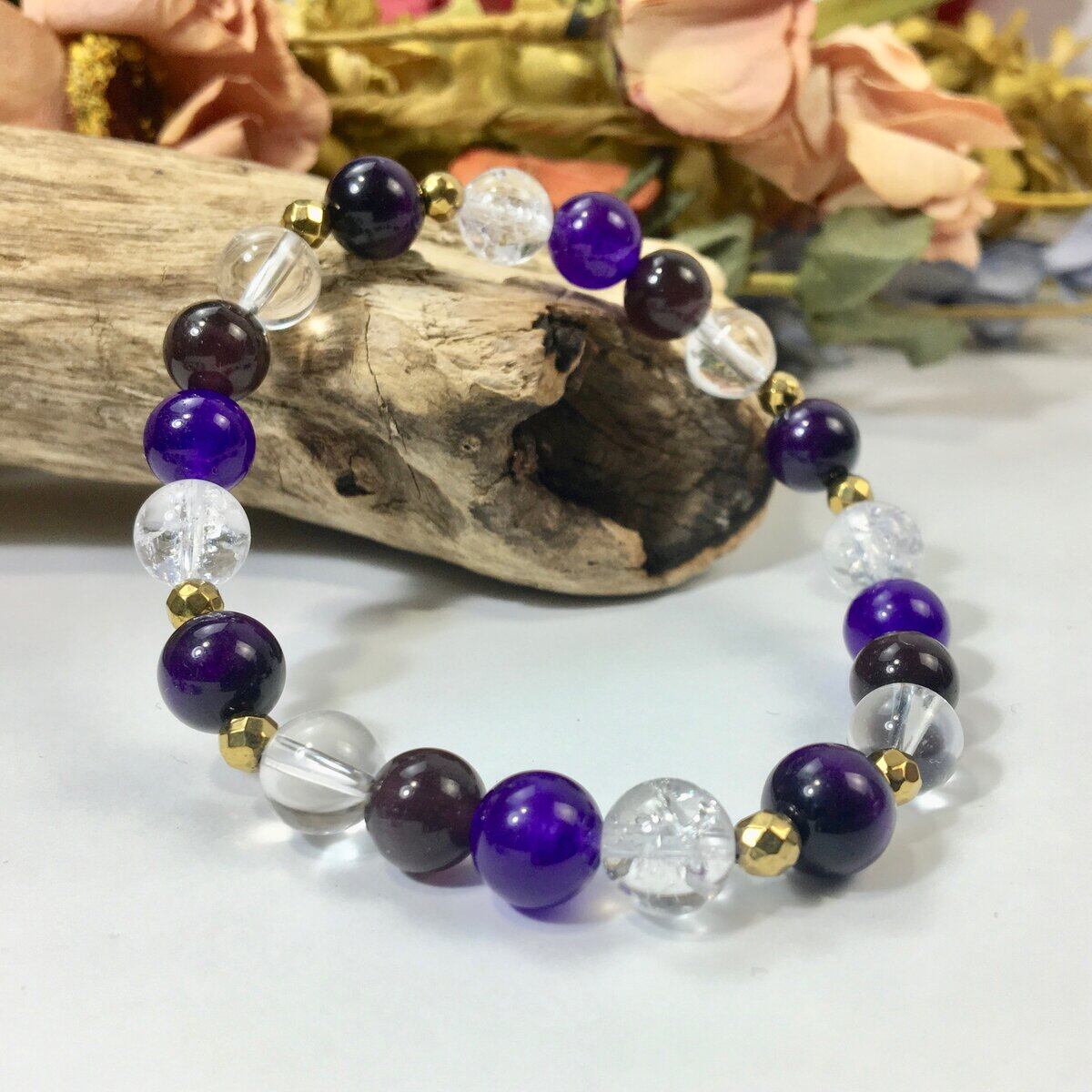 こちらは、8mm玉のパープルタイガーアイ、キャッツアイ、水晶、ジェイド、クラック水晶を使ったパワーストーンブレスレットです。今回は石との間にはゴールドのヘマタイトを加えアクセントとしております。今回は5種の石を使い可愛らしいデザインに仕上げています。サイズは内周 約16cm(手首周りを測り少し余裕をもってお買い求めくださいませ) 気になる方は是非この機会にどうぞ。