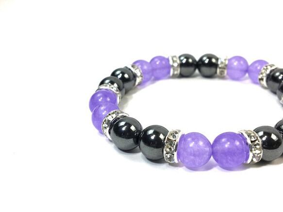 こちらは、8mm玉のジェイド(ラベンダーパープル)とヘマタイトを使用したパワーストーンブレスレットです。間にはロンデルを挟み高級感ある大人っぽいデザインに仕上がっています。サイズは内周約15cmです。気になる方は是非この機会にどうぞ。