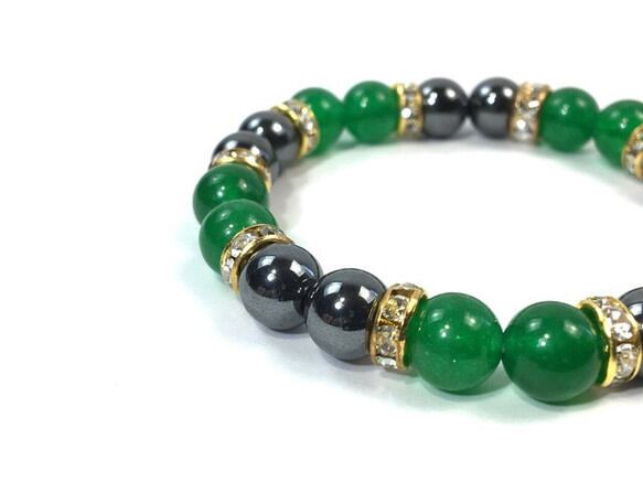 こちらは、8mm玉のジェイド(グリーン)とヘマタイトを使用したパワーストーンブレスレットです。間にはロンデルを挟み高級感ある大人っぽいデザインに仕上がっています。サイズは内周約15cmです。気になる方は是非この機会にどうぞ。