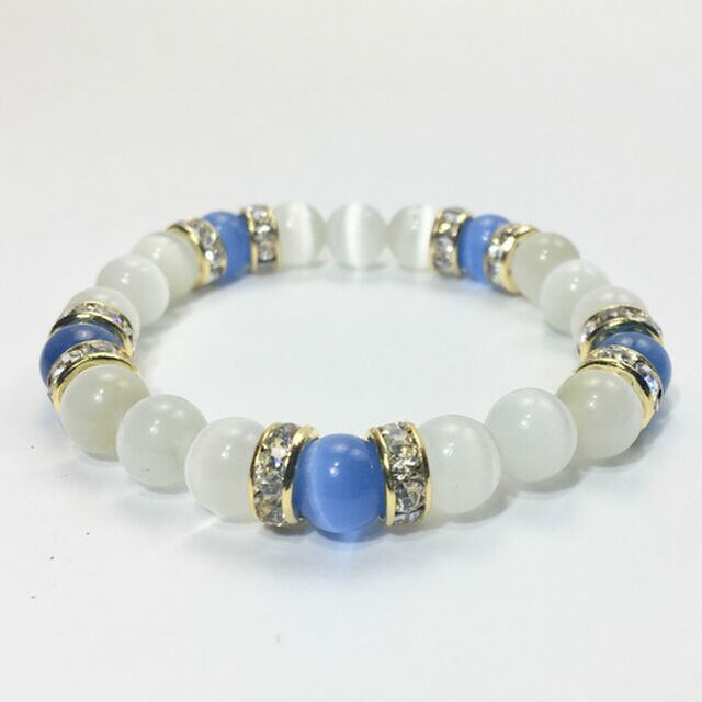 こちらは、8mm玉のブルーキャッツアイとホワイトキャッツアイを組み合わせたパワーストーンブレスレットです。今回は五芒星デザインで石を配置しております。五芒星とは、陰陽道の基本概念となった陰陽五行説、木・火・土・金・水の5つの元素の働きの相克を表したものであり、五芒星は厄除・開運を願うデザインと重宝されているデザインです。サイズは内周約14cmです。気になる方は是非この機会にどうぞ。