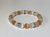 こちらは、8mm玉のオレンジキャッツアイとホワイトキャッツアイを使用したパワーストーンブレスレットです。間にはシルバーのロンデルを挟み高級感ある大人っぽいデザインに仕上がっています。内周約14cmです。気になる方は是非この機会にどうぞ。