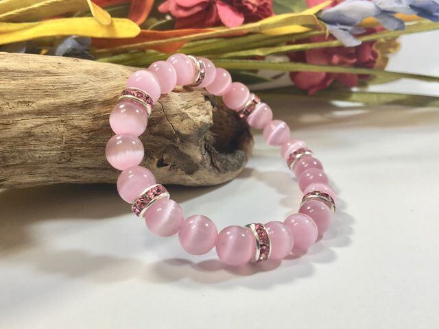 こちらは、8mm玉のピンクキャッツアイを使用したパワーストーンブレスレットです。間にはピンクのロンデルを挟み高級感ある大人っぽいデザインに仕上がっています。内周約14cmです。気になる方は是非この機会にどうぞ。