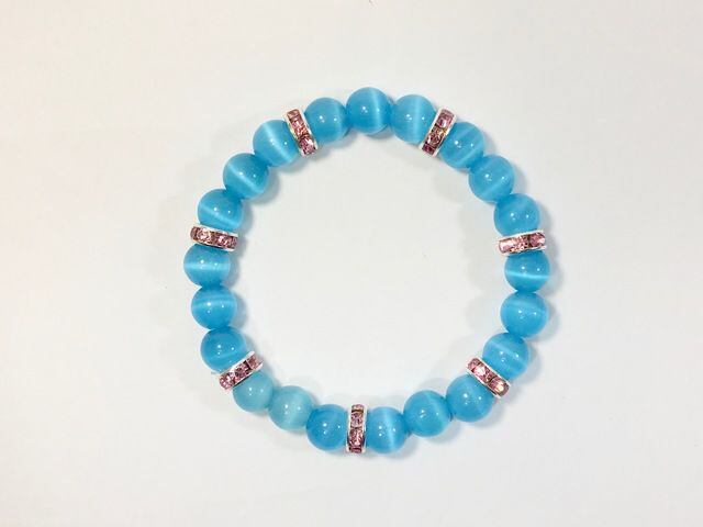 こちらは、8mm玉のライトブルーキャッツアイを使用したパワーストーンブレスレットです。間にはピンクのロンデルを挟み高級感ある大人っぽいデザインに仕上がっています。内周約14cmです。気になる方は是非この機会にどうぞ。