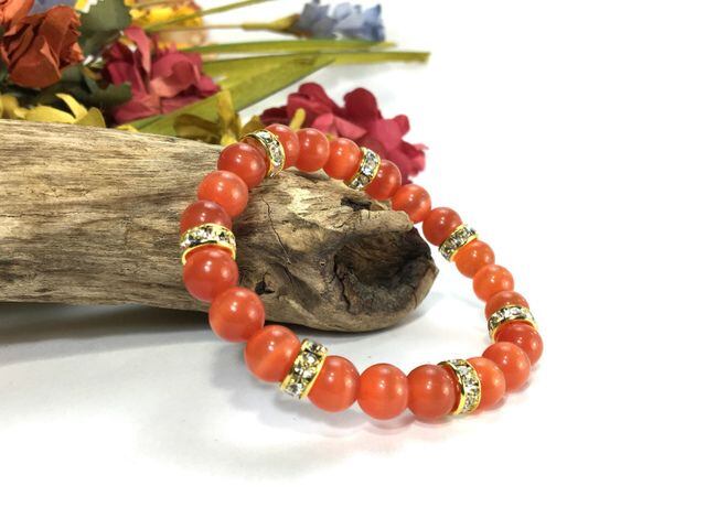 こちらは、8mm玉のレッドキャッツアイを使用したパワーストーンブレスレットです。間にはゴールドのロンデルを挟み高級感ある大人っぽいデザインに仕上がっています。内周約14cmです。気になる方は是非この機会にどうぞ。