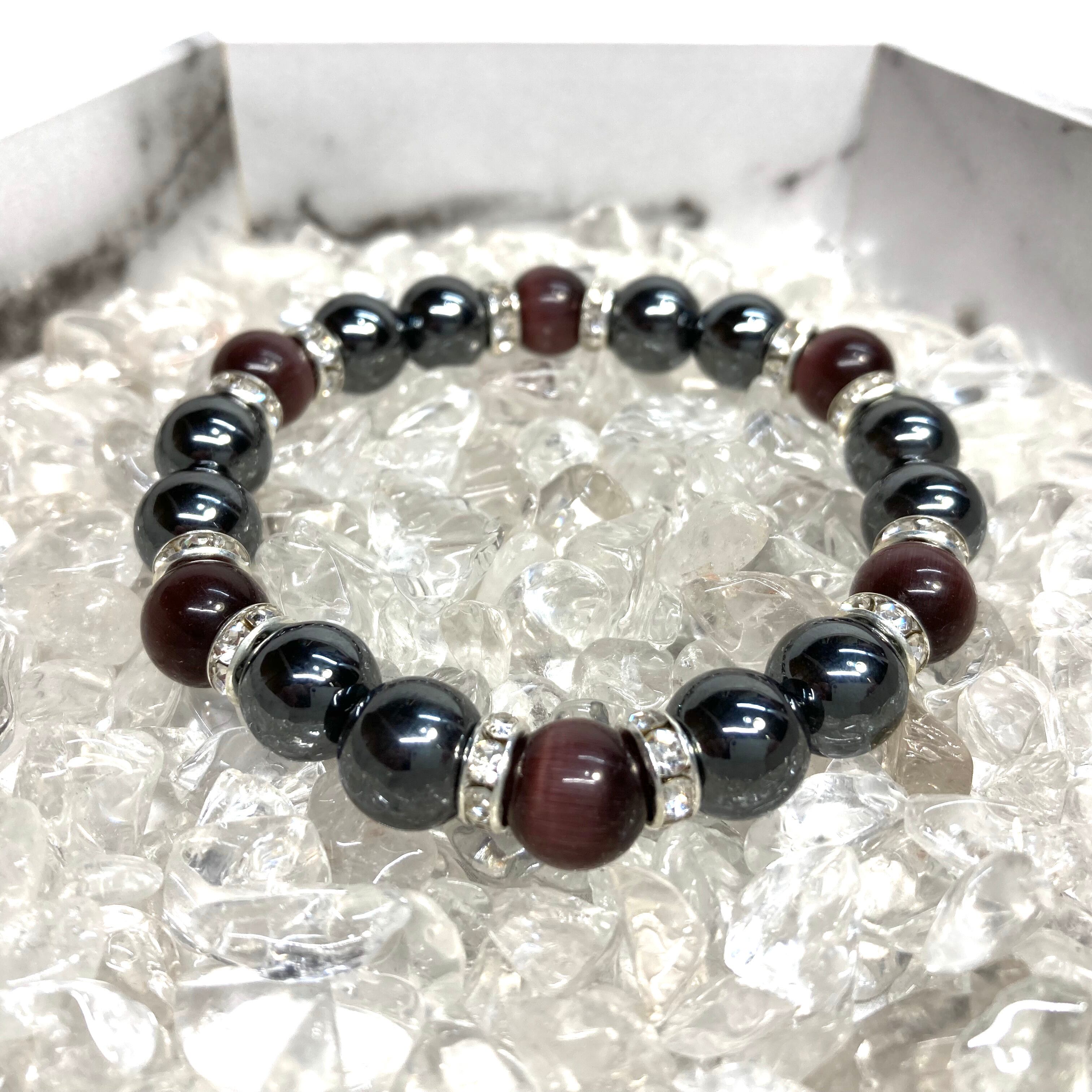 こちらは、キャッツアイとヘマタイトを組み合わせたブレスレットです。間にはロンデルを挟み高級感あるデザインに仕上がっています。石大きさは腕にも馴染みやすいように10mm玉で内周約16cm(伸可能)です。数に限りがございますので気になる方はお早めにどうぞ。