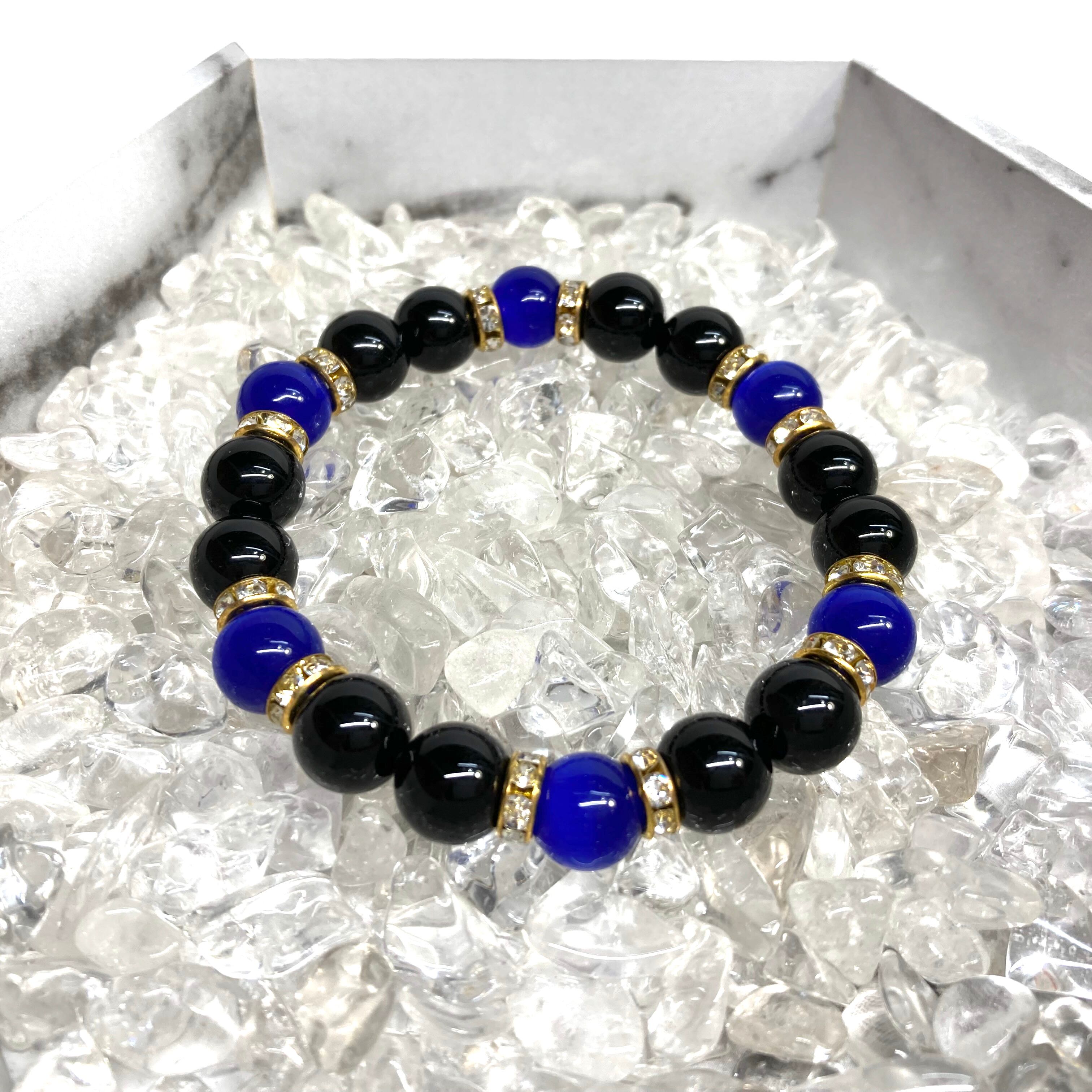 キャッツアイ(ダークブルー) オニキス パワーストーン ブレスレット (ゴールド) メンズ・レディース 男性・女性 数珠ブレス 開運