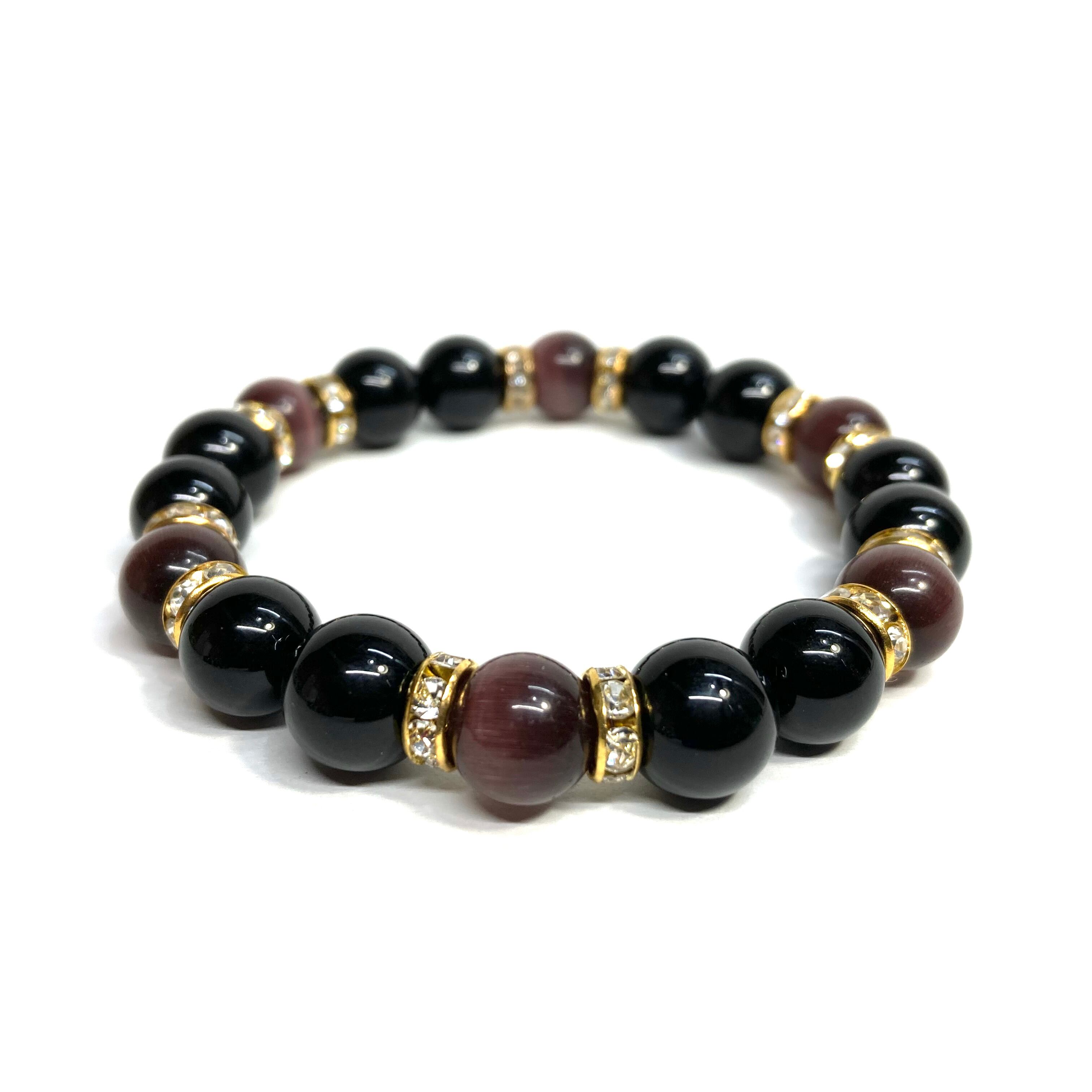 こちらは、キャッツアイとオニキスを組み合わせたブレスレットです。間にはロンデルを挟み高級感あるデザインに仕上がっています。石大きさは腕にも馴染みやすいように10mm玉で内周約16cm(伸可能)です。数に限りがございますので気になる方はお早めにどうぞ。