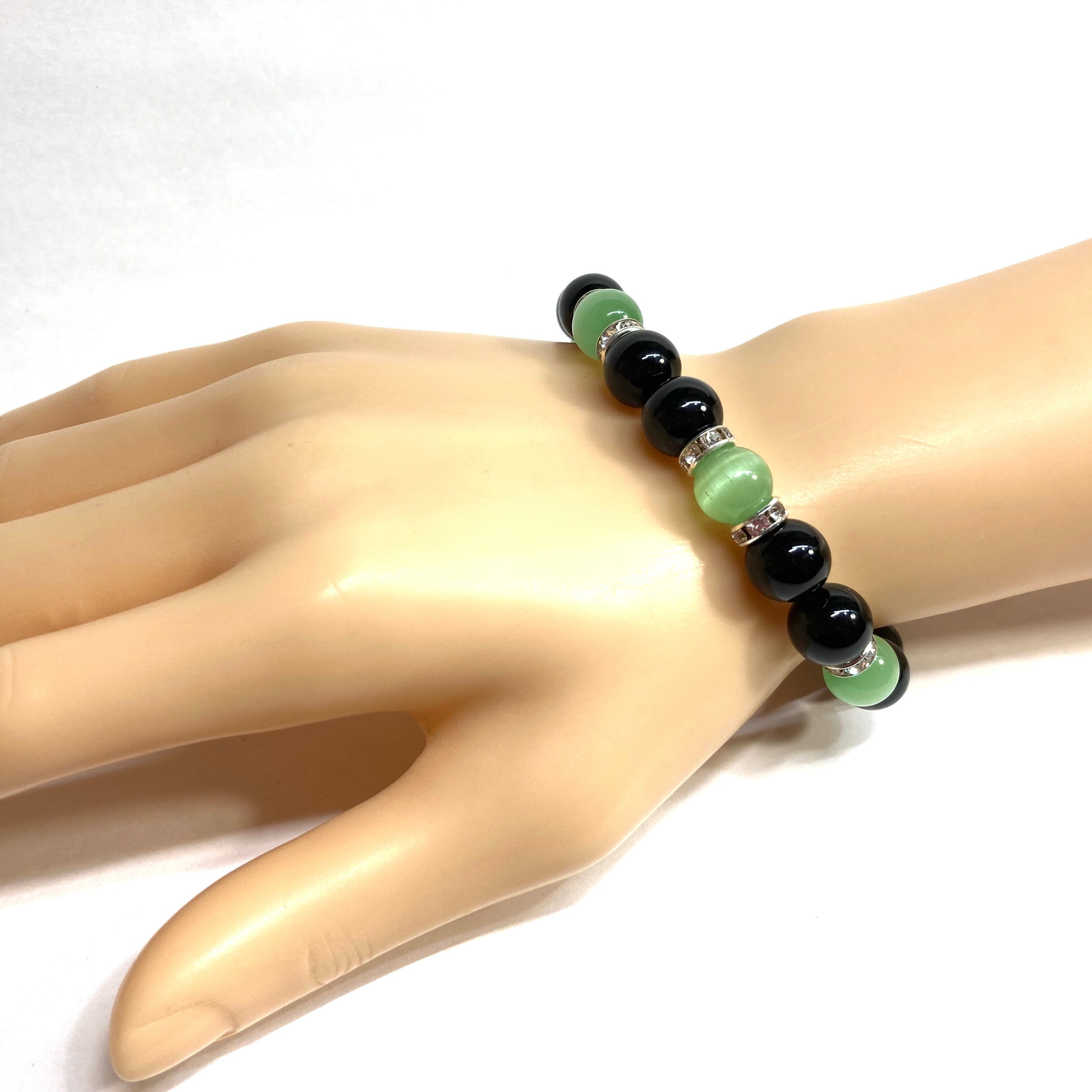 こちらは、キャッツアイとオニキスを組み合わせたブレスレットです。間にはロンデルを挟み高級感あるデザインに仕上がっています。石大きさは腕にも馴染みやすいように10mm玉で内周約16cm(伸可能)です。数に限りがございますので気になる方はお早めにどうぞ。