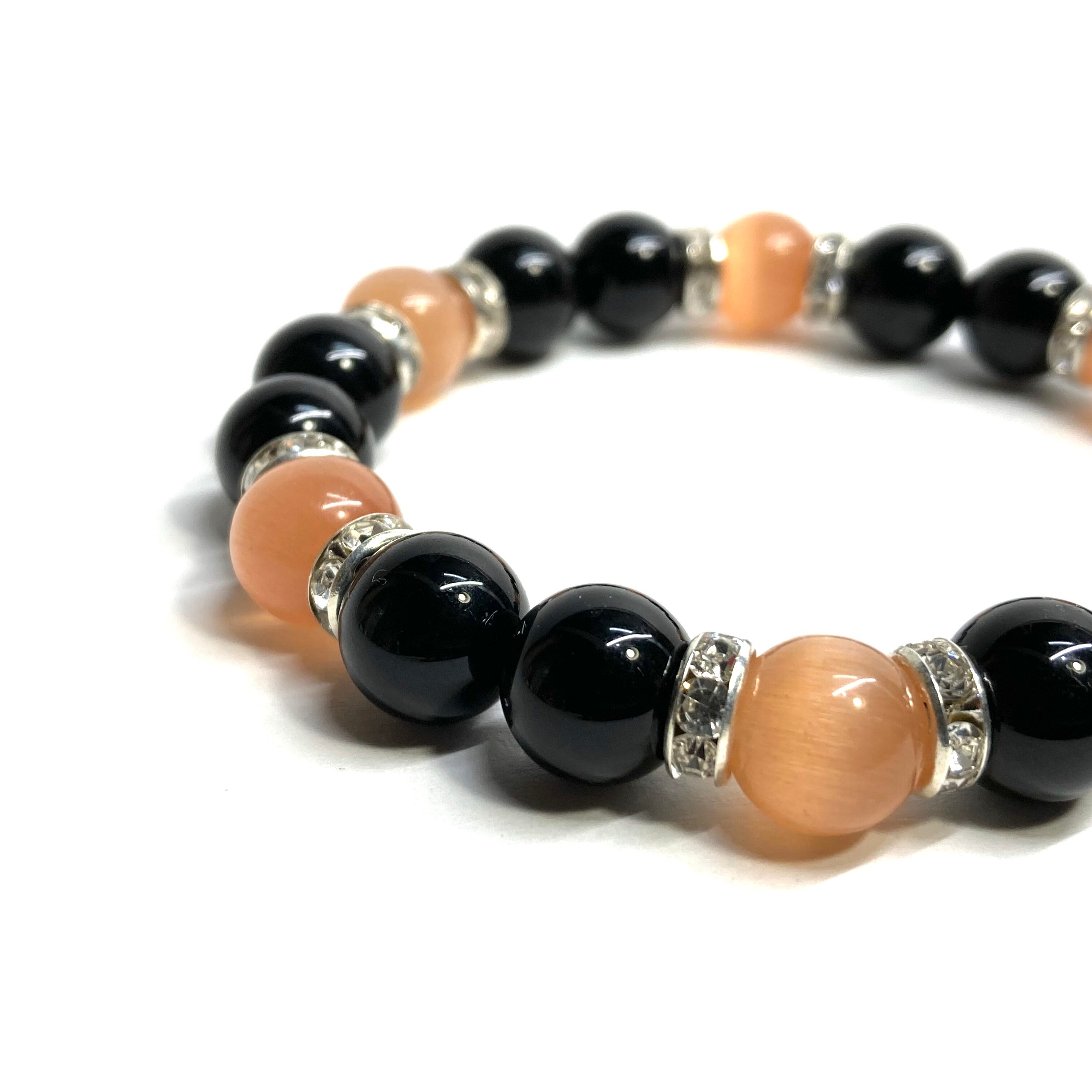 こちらは、キャッツアイとオニキスを組み合わせたブレスレットです。間にはロンデルを挟み高級感あるデザインに仕上がっています。石大きさは腕にも馴染みやすいように10mm玉で内周約16cm(伸可能)です。数に限りがございますので気になる方はお早めにどうぞ。
