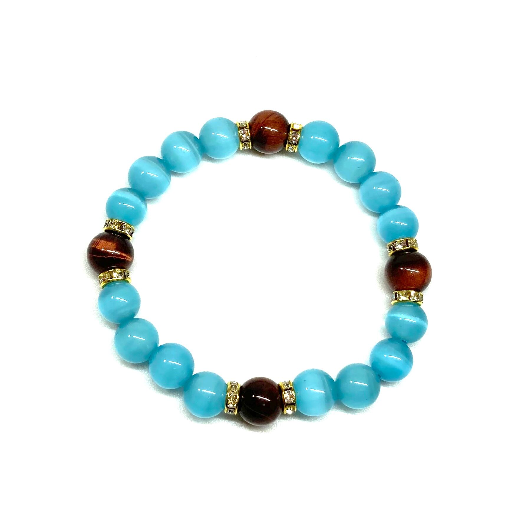 こちらは、キャッツアイとレッドタイガーアイを組み合わせたブレスレットです。間にはロンデルを挟み高級感あるデザインに仕上がっています。石大きさは腕にも馴染みやすいように10mm玉で内周約17cm(伸可能)です。数に限りがございますので気になる方はお早めにどうぞ。