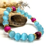 こちらは、キャッツアイとピンクタイガーアイを組み合わせたブレスレットです。間にはロンデルを挟み高級感あるデザインに仕上がっています。石大きさは腕にも馴染みやすいように10mm玉で内周約17cm(伸可能)です。数に限りがございますので気になる方はお早めにどうぞ。