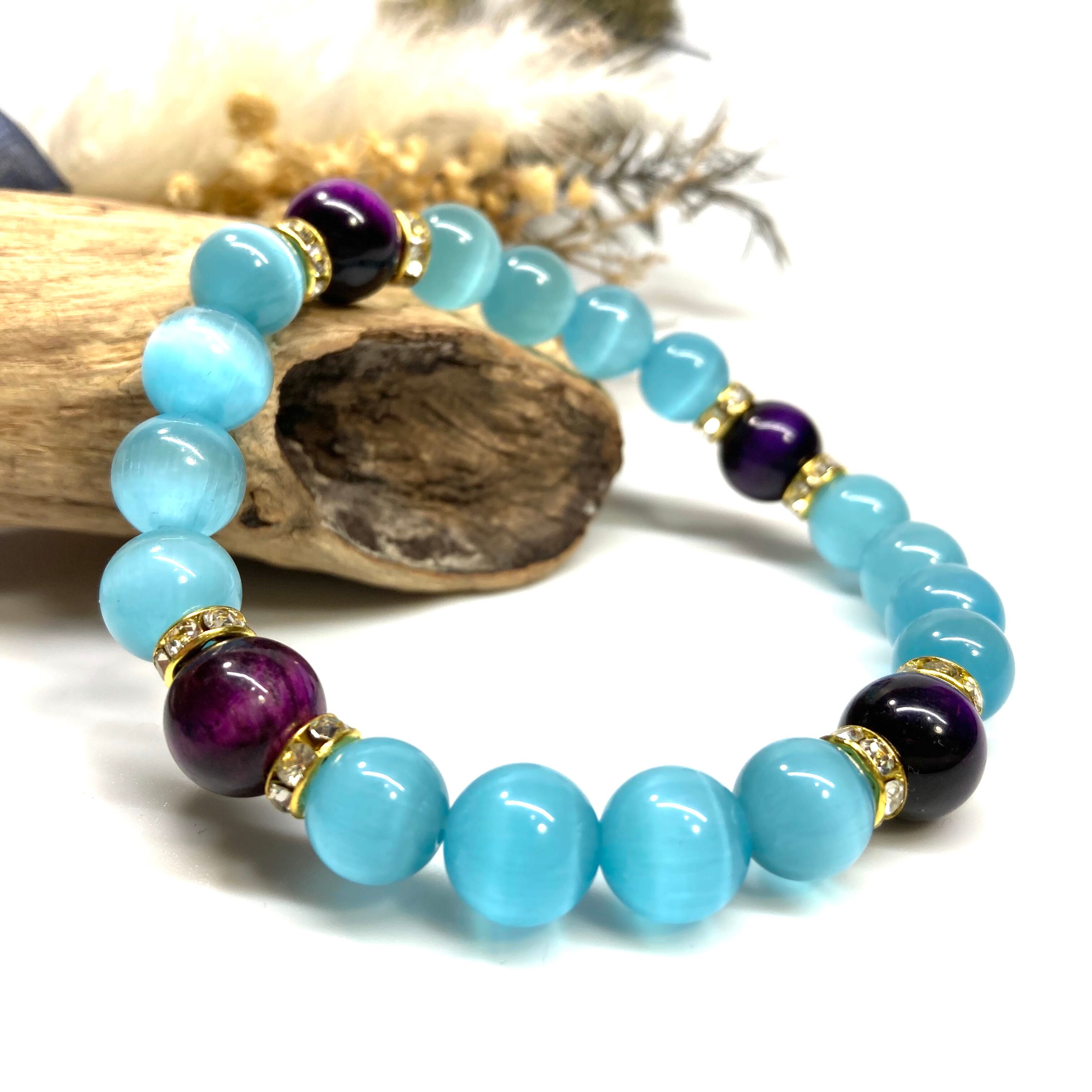 こちらは、キャッツアイとパープルタイガーアイを組み合わせたブレスレットです。間にはロンデルを挟み高級感あるデザインに仕上がっています。石大きさは腕にも馴染みやすいように10mm玉で内周約17cm(伸可能)です。数に限りがございますので気になる方はお早めにどうぞ。