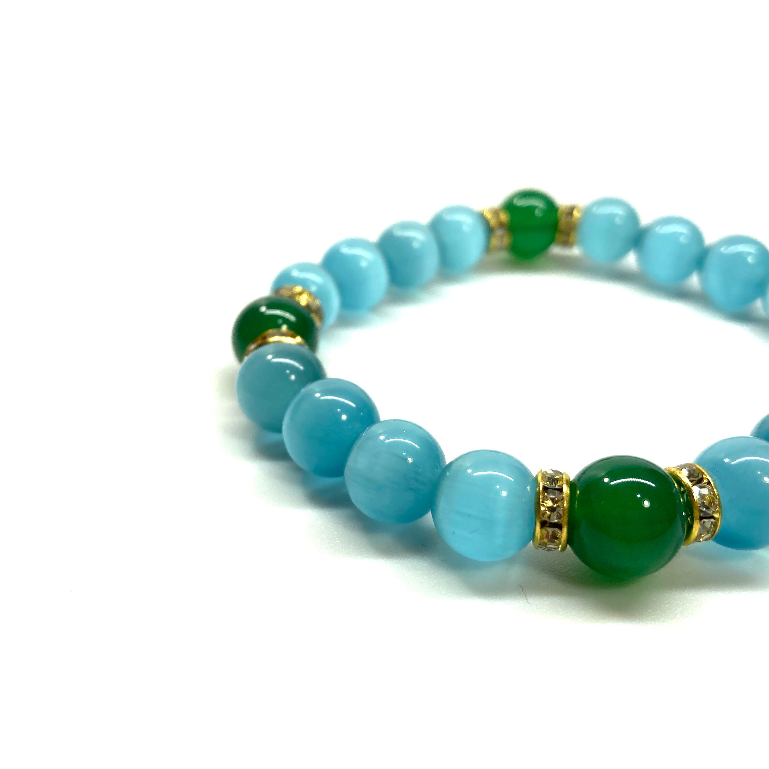 キャッツアイ(ライトブルー)×緑瑪瑙 パワーストーン ブレスレット (ゴールド) メンズ・レディース 男性・女性 数珠ブレス 開運