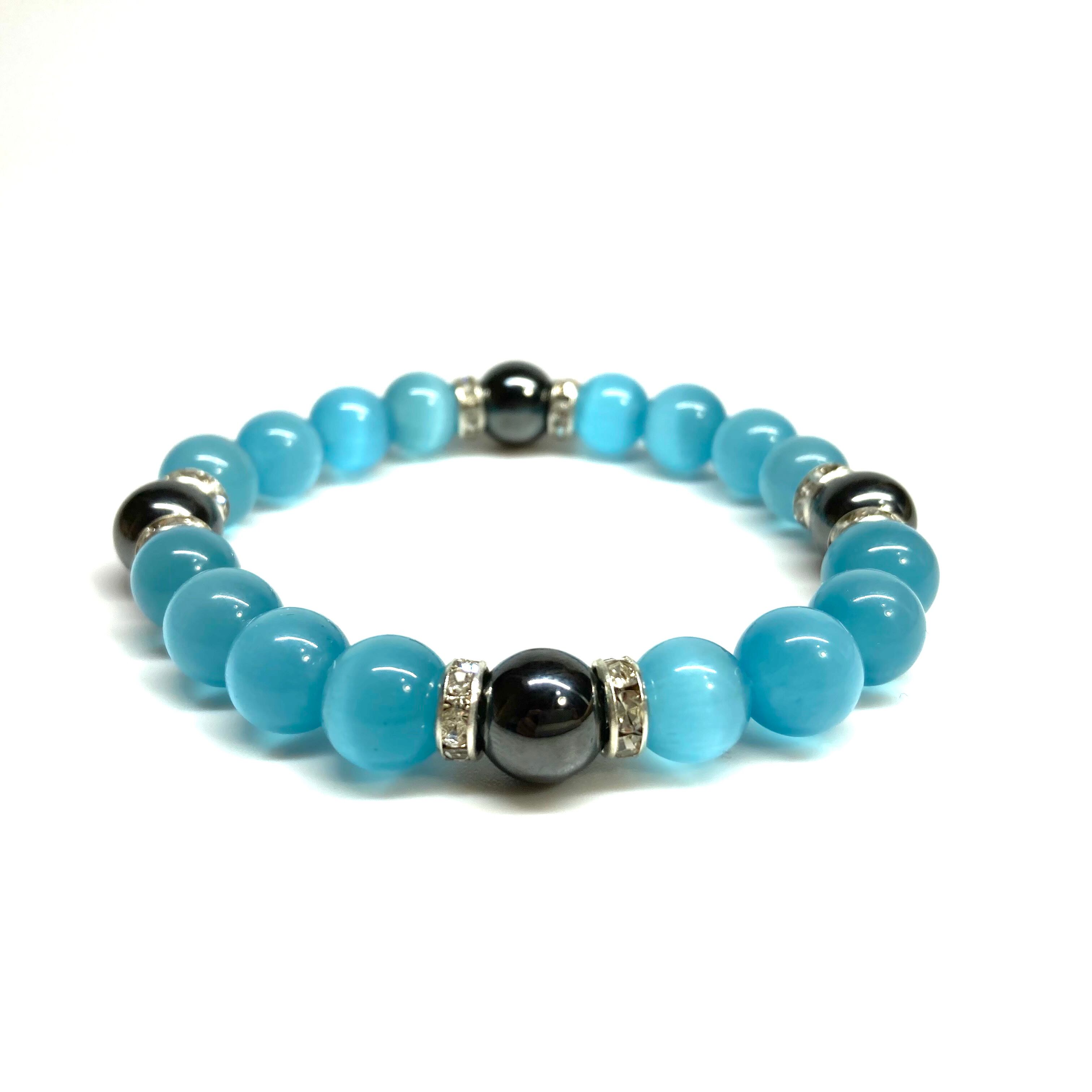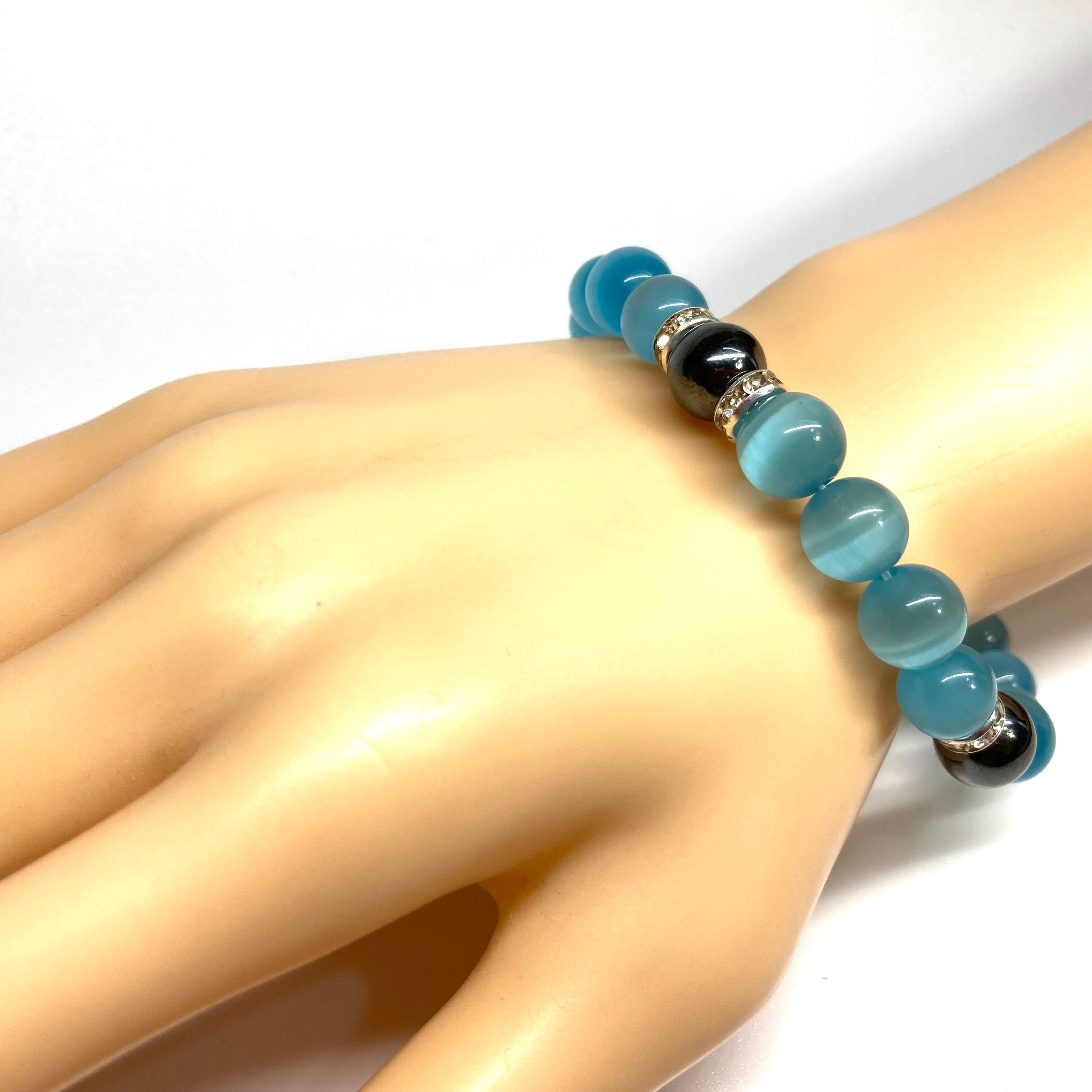 キャッツアイ(ライトブルー)×ヘマタイト パワーストーン ブレスレット (シルバー) メンズ・レディース 男性・女性 数珠ブレス 開運