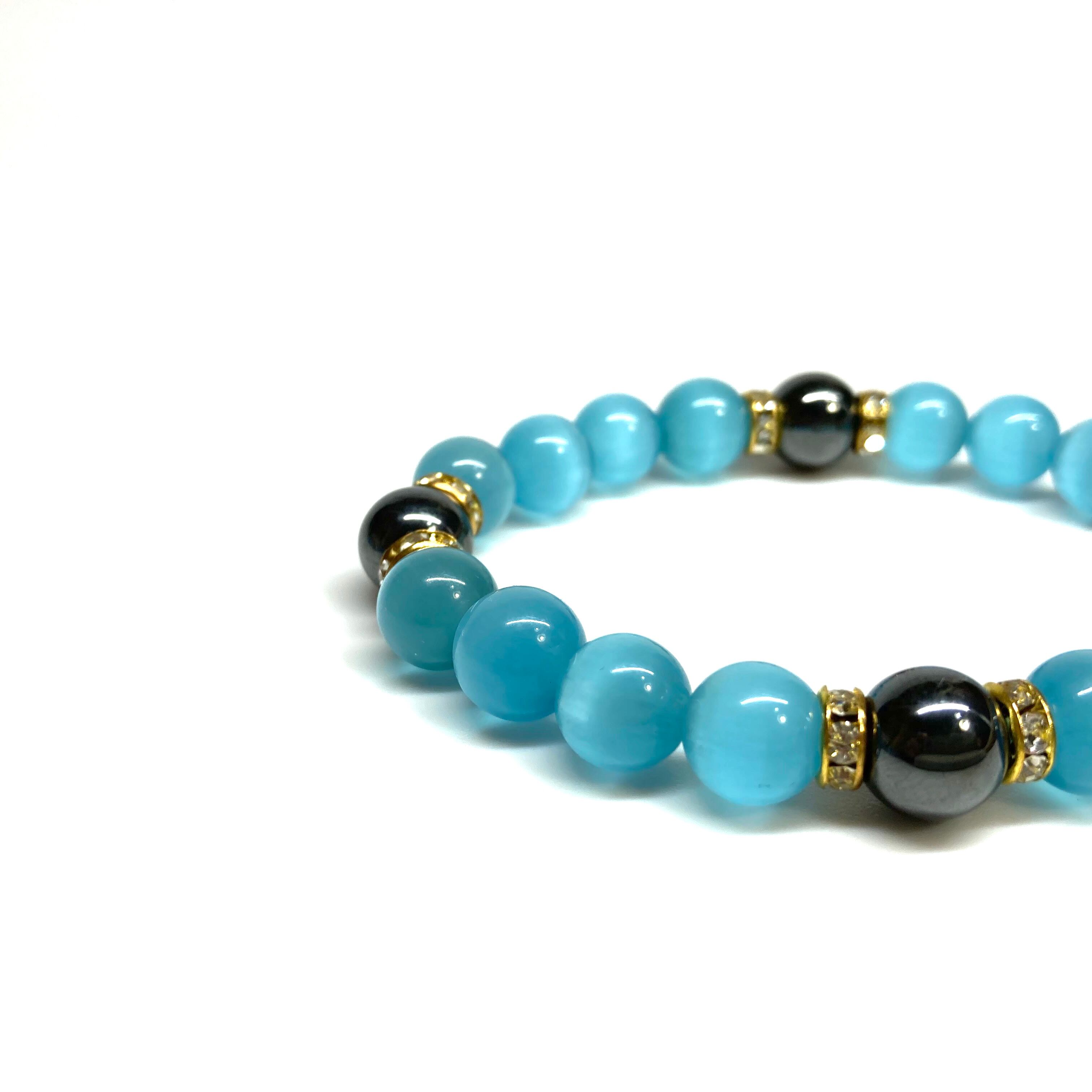 キャッツアイ(ライトブルー)×ヘマタイト パワーストーン ブレスレット (ゴールド) メンズ・レディース 男性・女性 数珠ブレス 開運