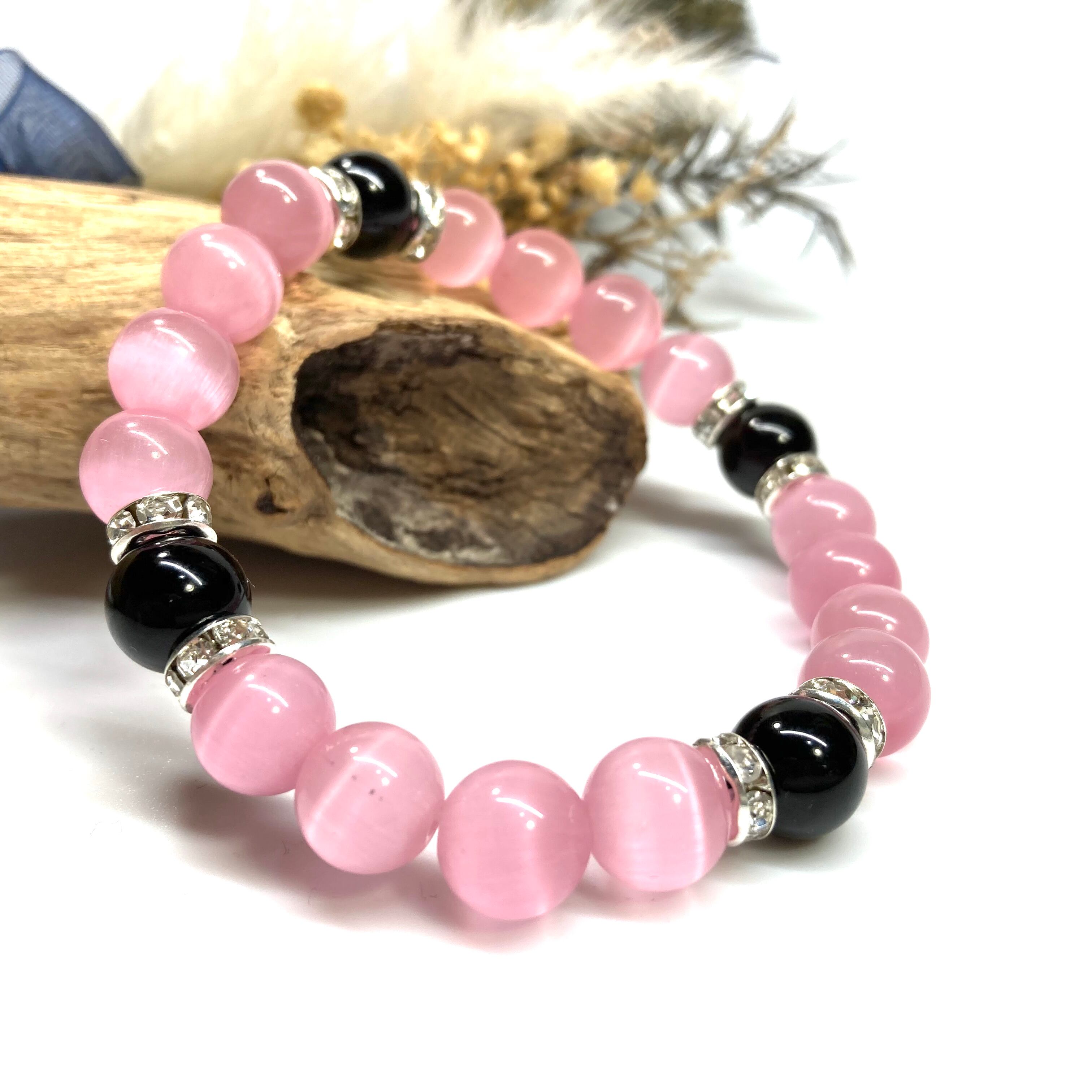 キャッツアイ(ピンク)×オニキス パワーストーン ブレスレット (シルバー) メンズ・レディース 男性・女性 数珠ブレス 開運