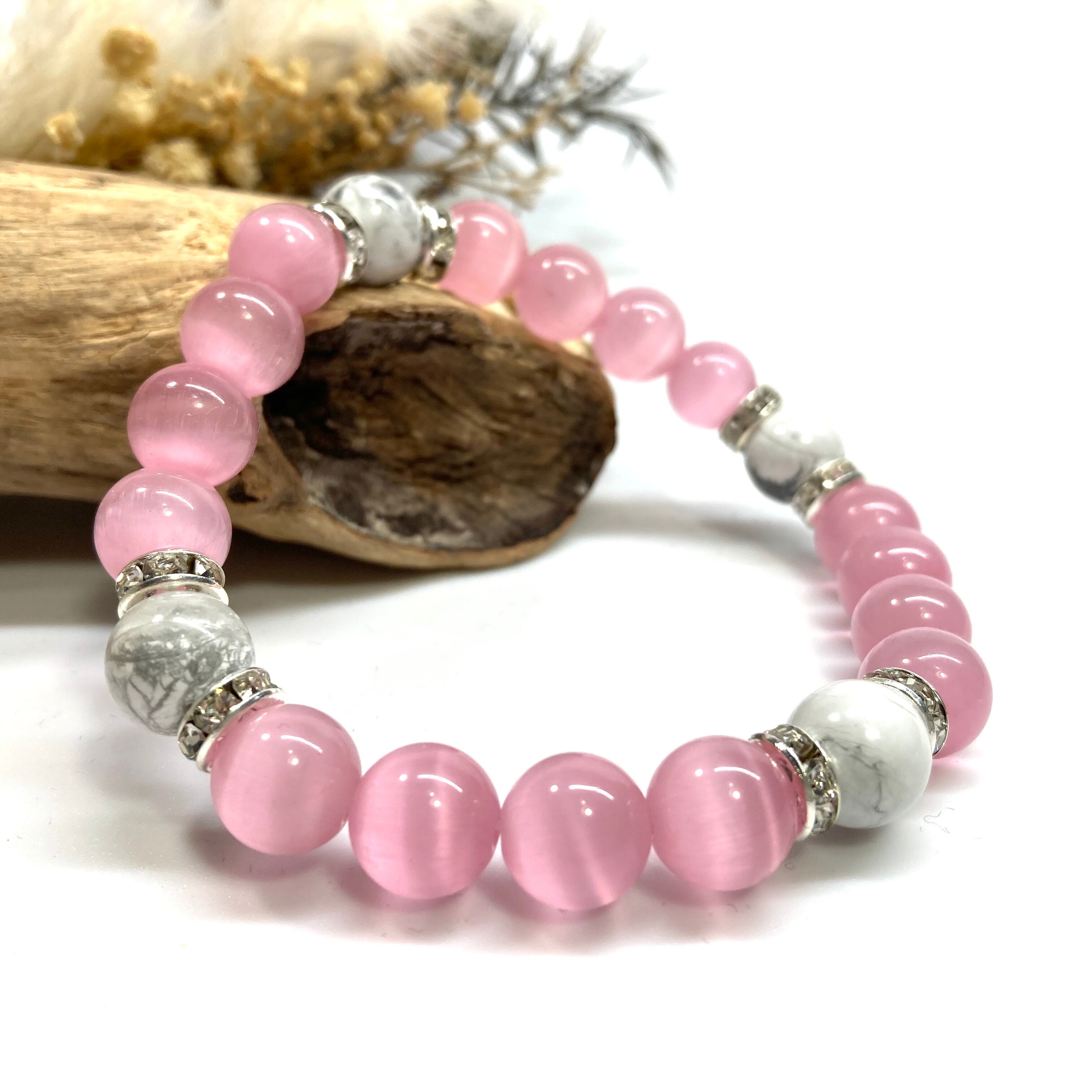 キャッツアイ(ピンク)×ハウライト パワーストーン ブレスレット (シルバー) メンズ・レディース 男性・女性 数珠ブレス 開運