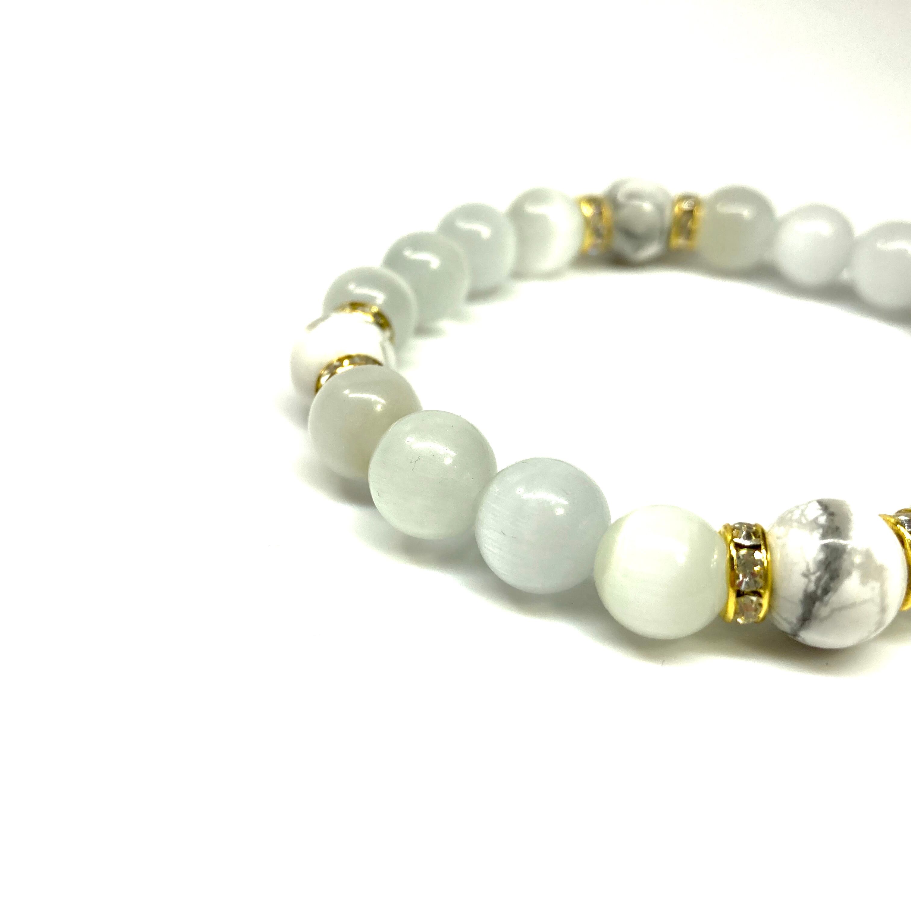 こちらは、キャッツアイとハウライトを組み合わせたブレスレットです。間にはロンデルを挟み高級感あるデザインに仕上がっています。石大きさは腕にも馴染みやすいように10mm玉で内周約17cm(伸可能)です。数に限りがございますので気になる方はお早めにどうぞ。