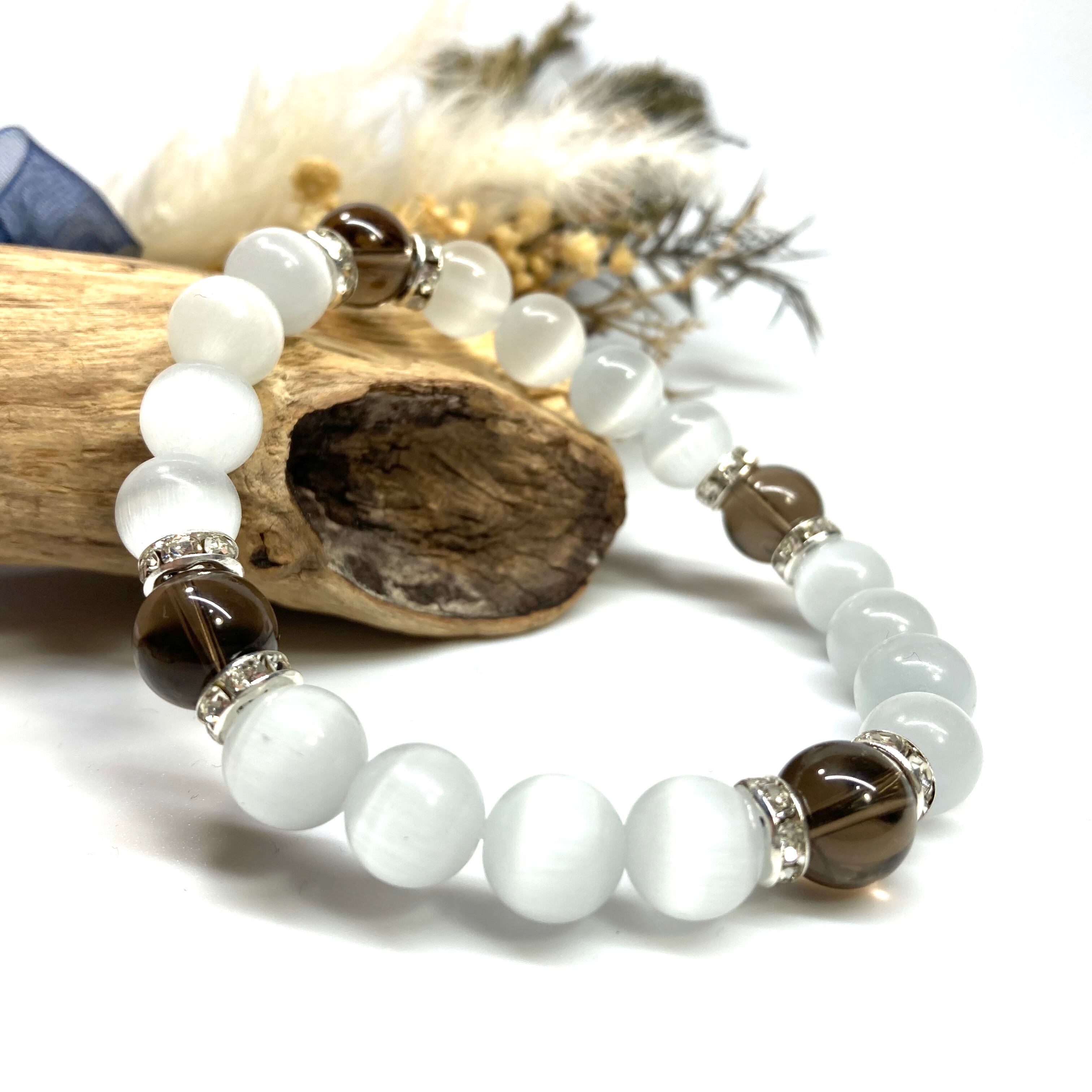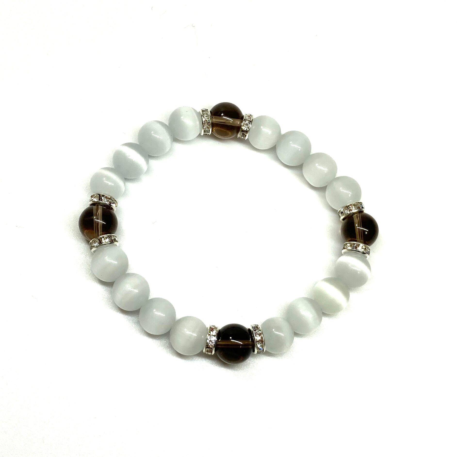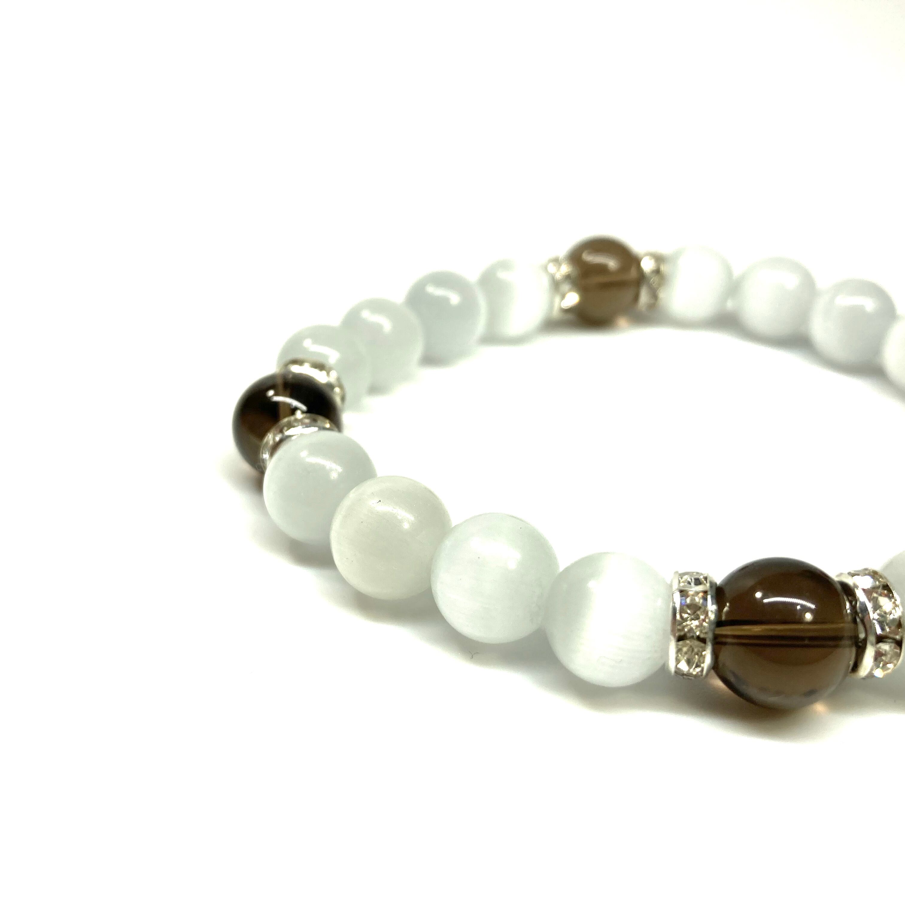 キャッツアイ(ホワイト)×スモーキークォーツ パワーストーン ブレスレット (シルバー) メンズ・レディース 男性・女性 数珠ブレス 開運