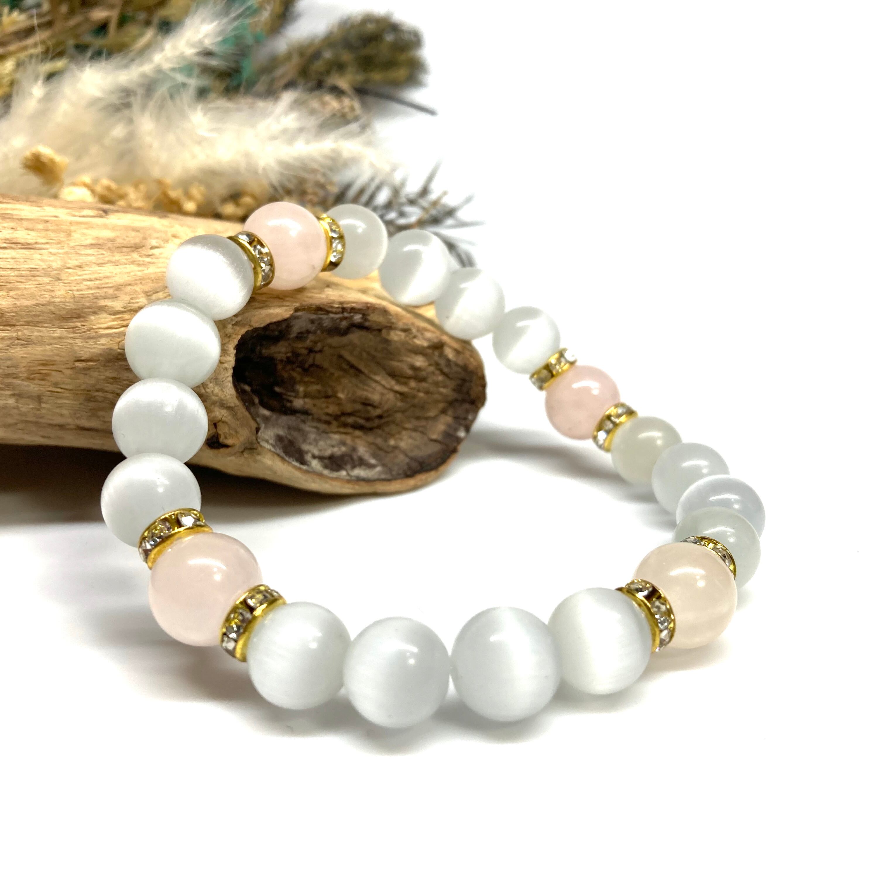 こちらは、キャッツアイとローズクォーツを組み合わせたブレスレットです。間にはロンデルを挟み高級感あるデザインに仕上がっています。石大きさは腕にも馴染みやすいように10mm玉で内周約17cm(伸可能)です。数に限りがございますので気になる方はお早めにどうぞ。