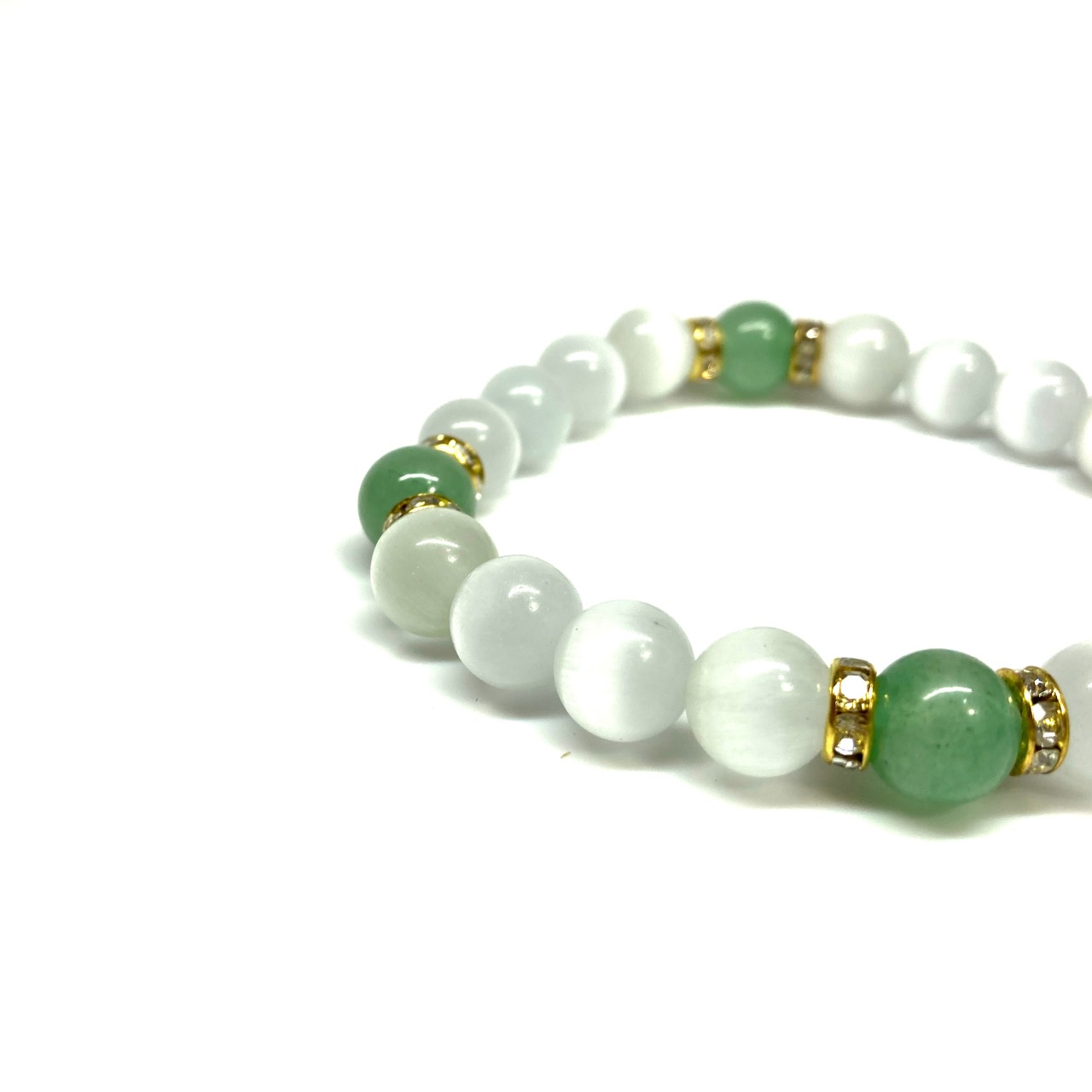 こちらは、キャッツアイとアベンチュリンを組み合わせたブレスレットです。間にはロンデルを挟み高級感あるデザインに仕上がっています。石大きさは腕にも馴染みやすいように10mm玉で内周約17cm(伸可能)です。数に限りがございますので気になる方はお早めにどうぞ。
