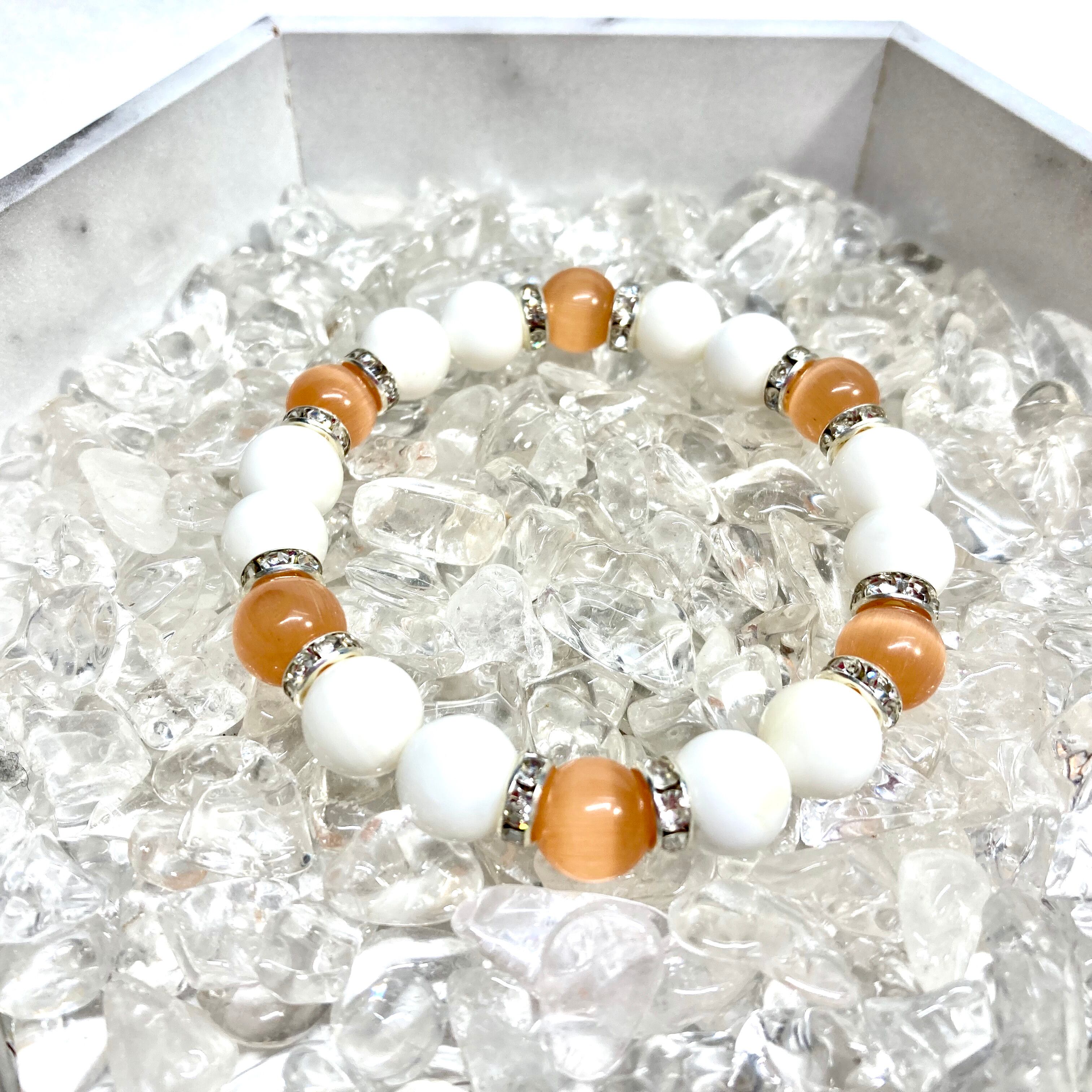 キャッツアイ(オレンジ) ホワイトオニキス パワーストーン ブレスレット (シルバー) メンズ・レディース 男性・女性 数珠ブレス 開運