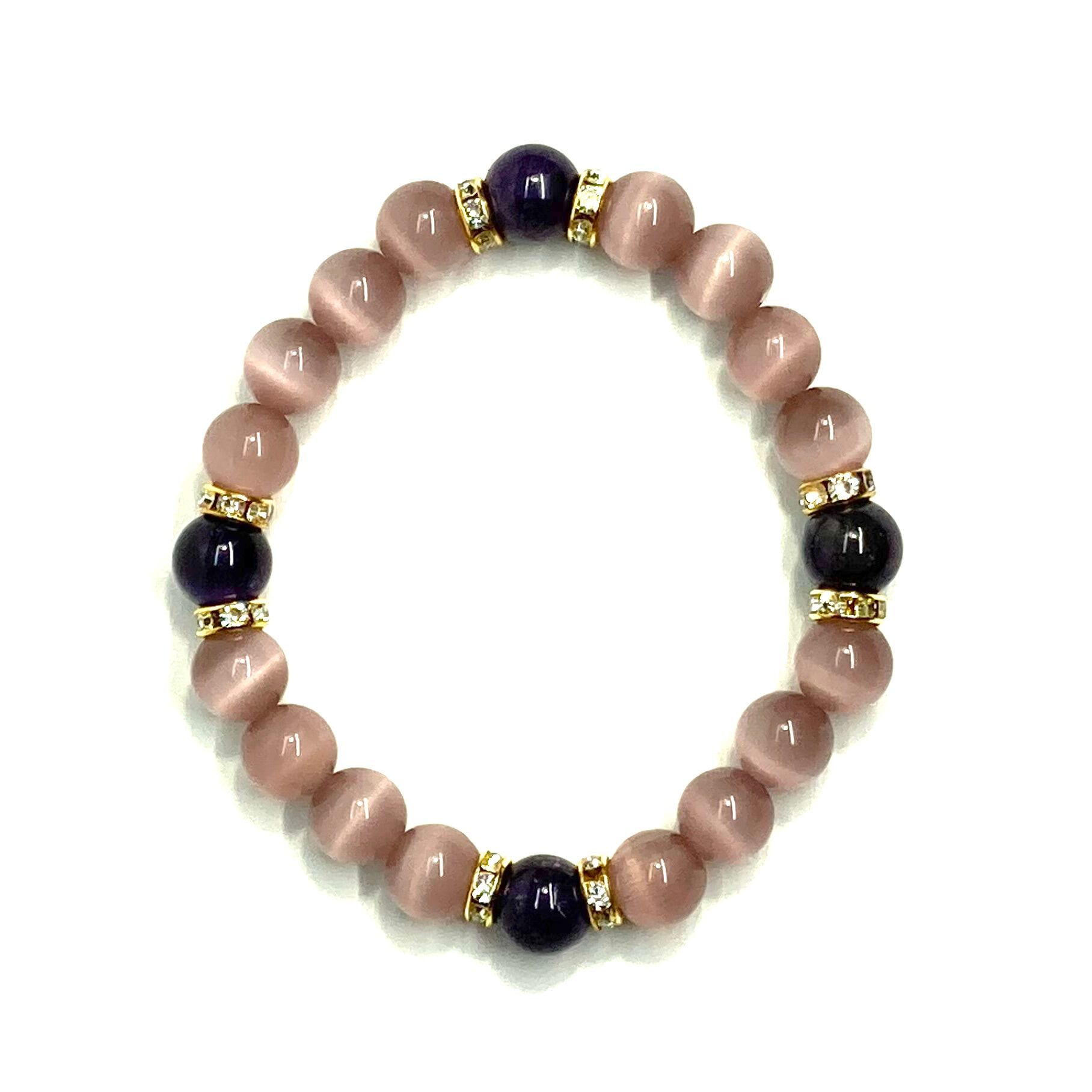 こちらは、キャッツアイとアメジストを組み合わせたブレスレットです。間にはロンデルを挟み高級感あるデザインに仕上がっています。石大きさは腕にも馴染みやすいように10mm玉で内周約17cm(伸可能)です。数に限りがございますので気になる方はお早めにどうぞ。