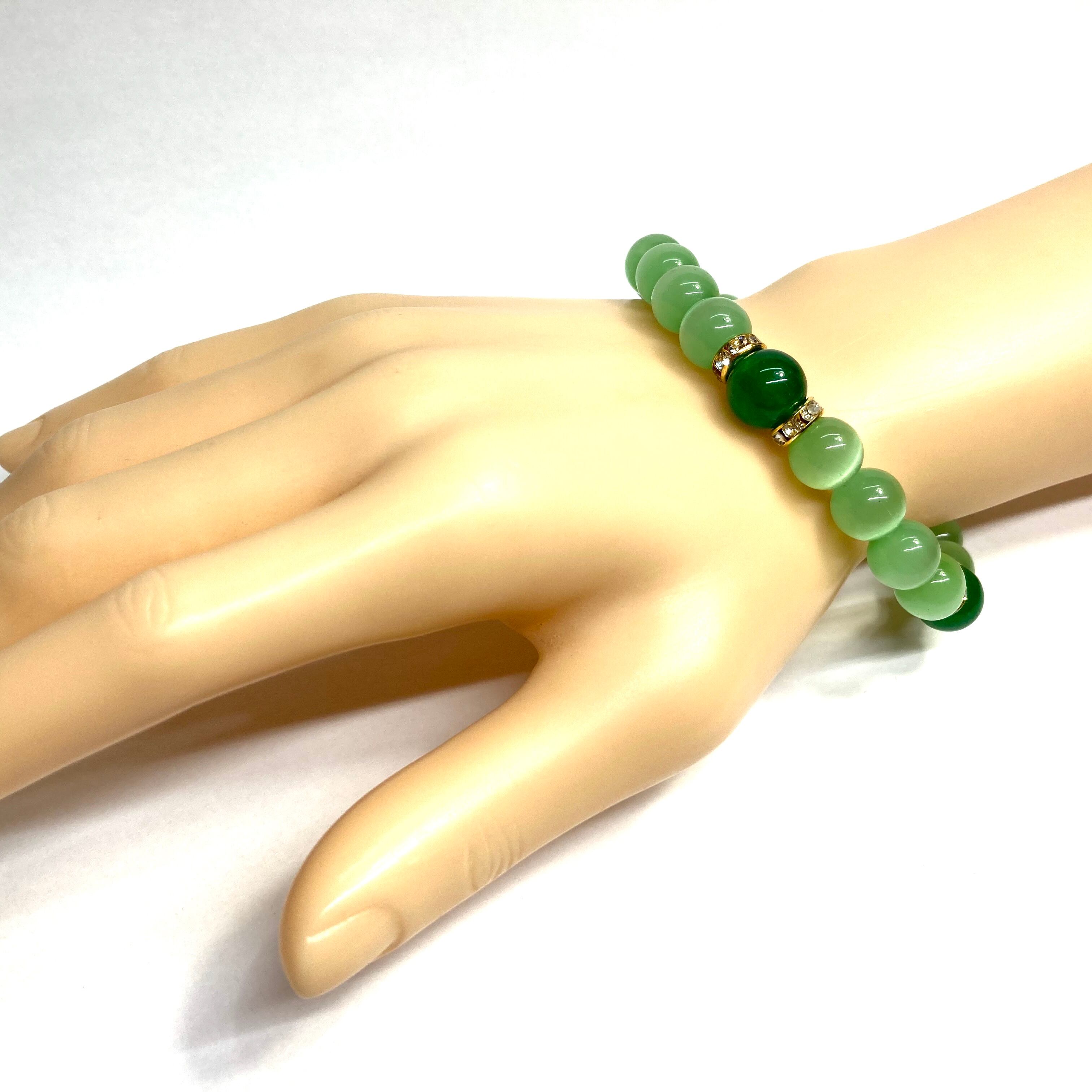 こちらは、キャッツアイと緑瑪瑙を組み合わせたブレスレットです。間にはロンデルを挟み高級感あるデザインに仕上がっています。石大きさは腕にも馴染みやすいように10mm玉で内周約17cm(伸可能)です。数に限りがございますので気になる方はお早めにどうぞ。